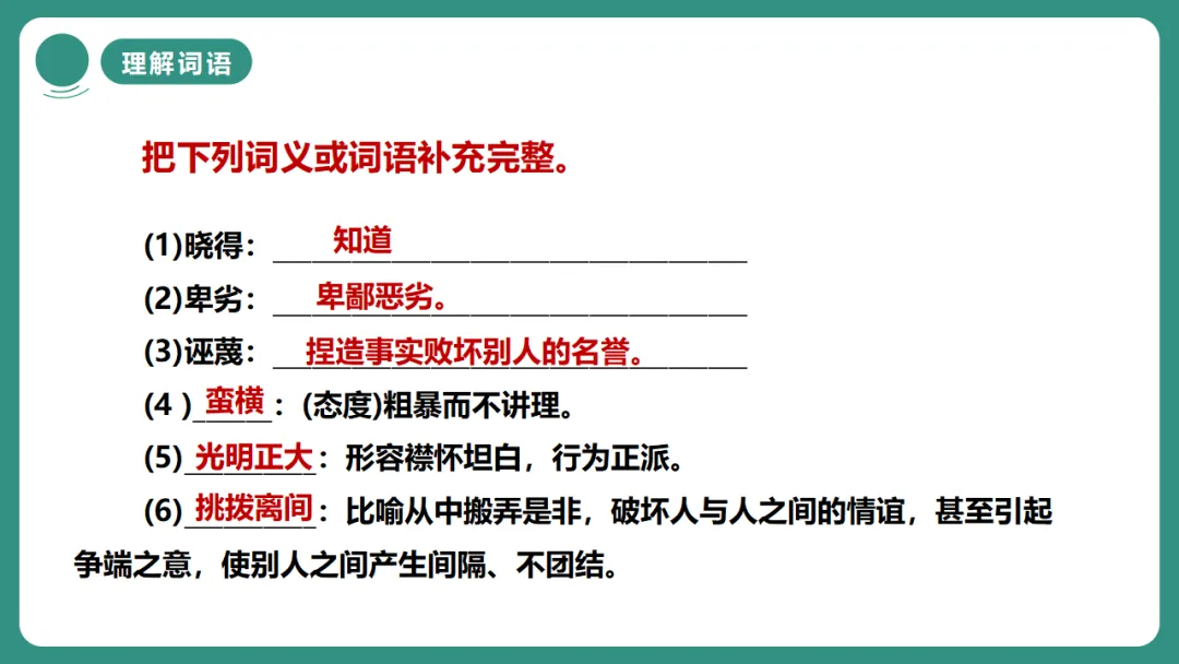 1.了解作者作品及写作背景,积累“诬蔑”“卑鄙”“蛮横”“挑拨离间”等易考词语。