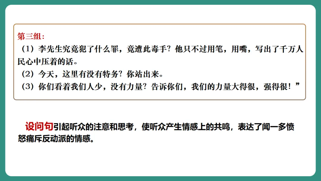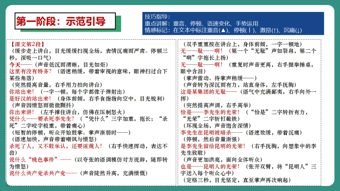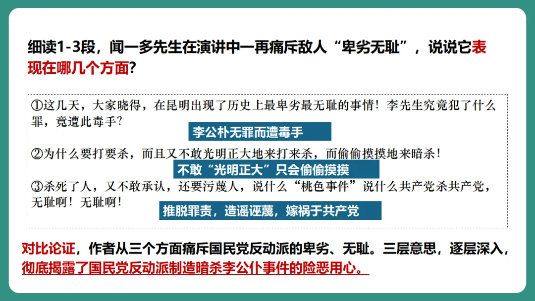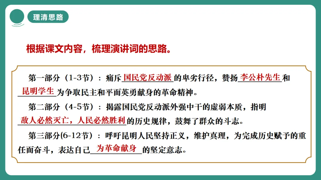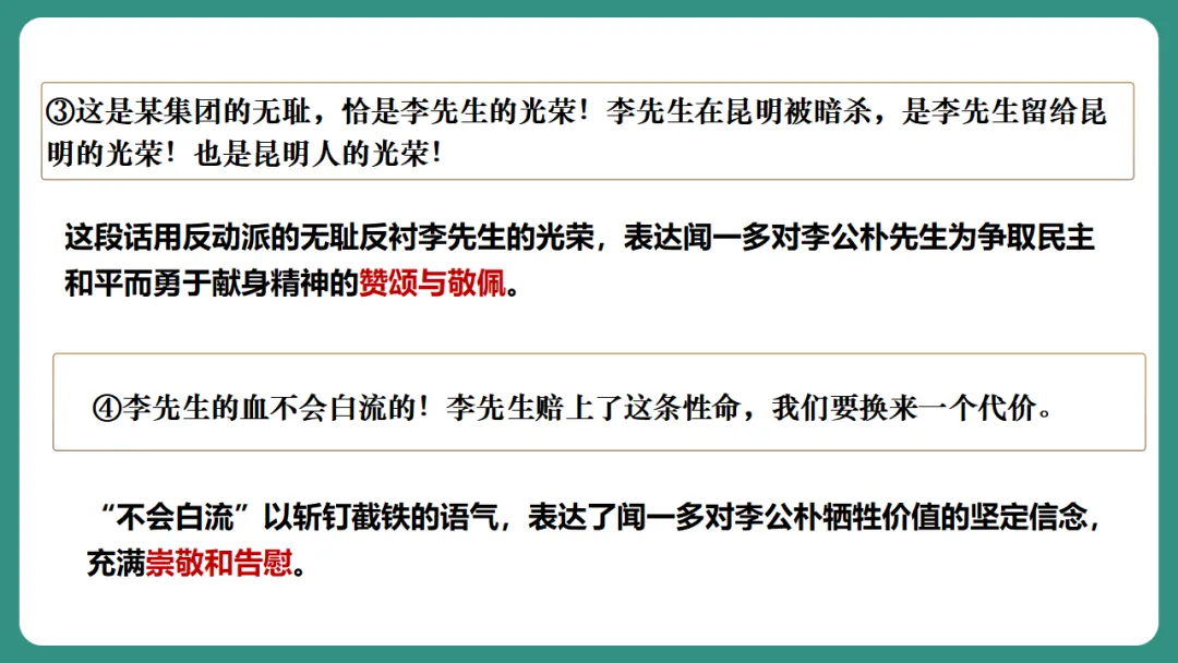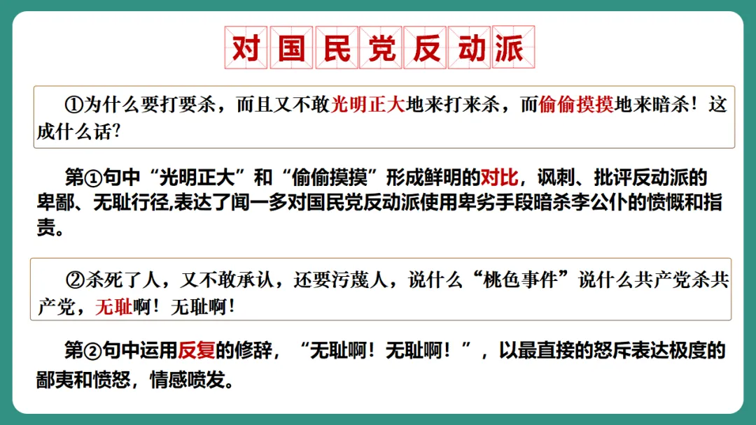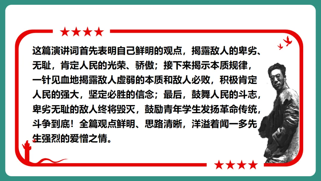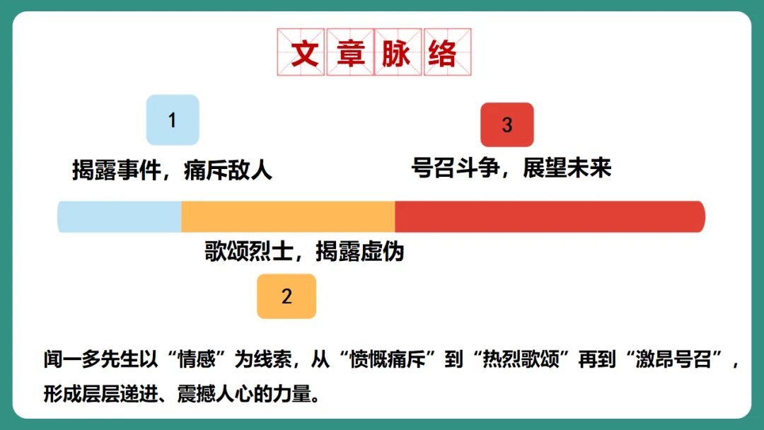 闻一多先生以“情感”为线索,从“愤慨痛斥”到“热烈歌颂”再到“激昂号召”,形成层层递进、震撼人心的力量。