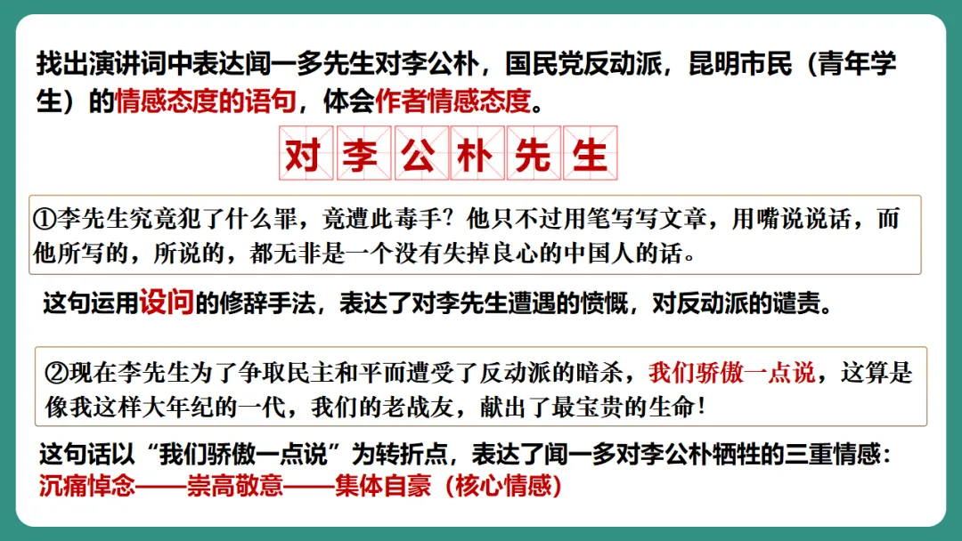 这句话以“我们骄傲一点说”为转折点,表达了闻一多对李公朴牺牲的三重情感:沉痛悼念——崇高敬意——集体自豪(核心情感)