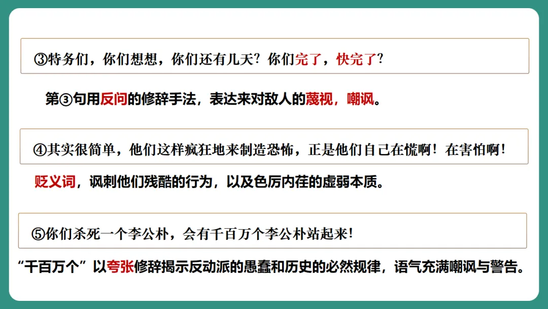 第②句中运用反复的修辞,“无耻啊!无耻啊!”,以最直接的怒斥表达极度的鄙夷和愤怒,情感喷发。