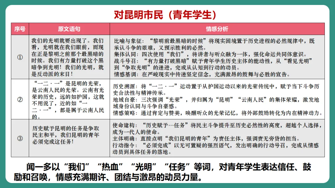 闻一多以“我们”“热血”“光明”“任务”等词,对青年学生表达信任、鼓励和召唤,情感充满期许、团结与激昂的动员力量。