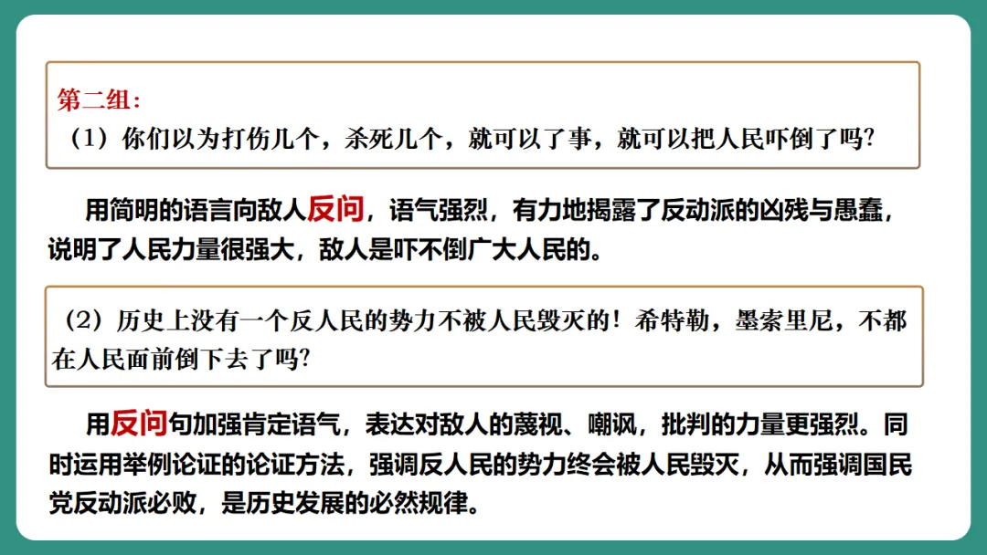 “千百万个”以夸张修辞揭示反动派的愚蠢和历史的必然规律,语气充满嘲讽与警告。