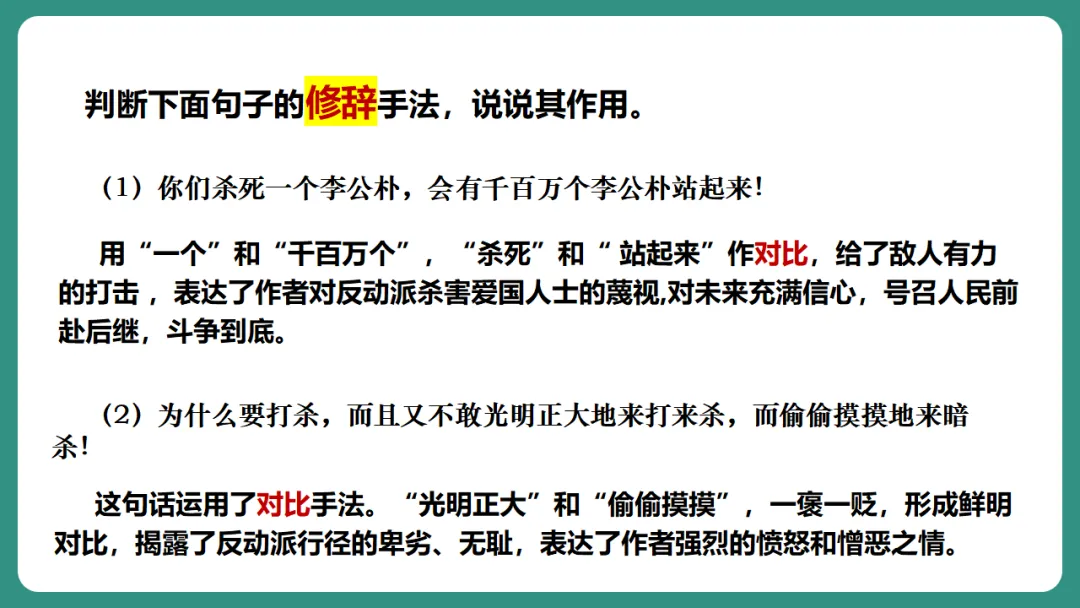 这句运用设问的修辞手法,表达了对李先生遭遇的愤慨,对反动派的谴责。