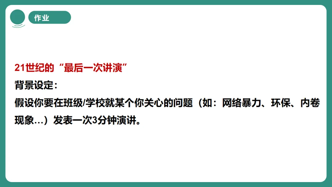 3.初步感知演讲词作为实用文体的基本特征和现场感染力。