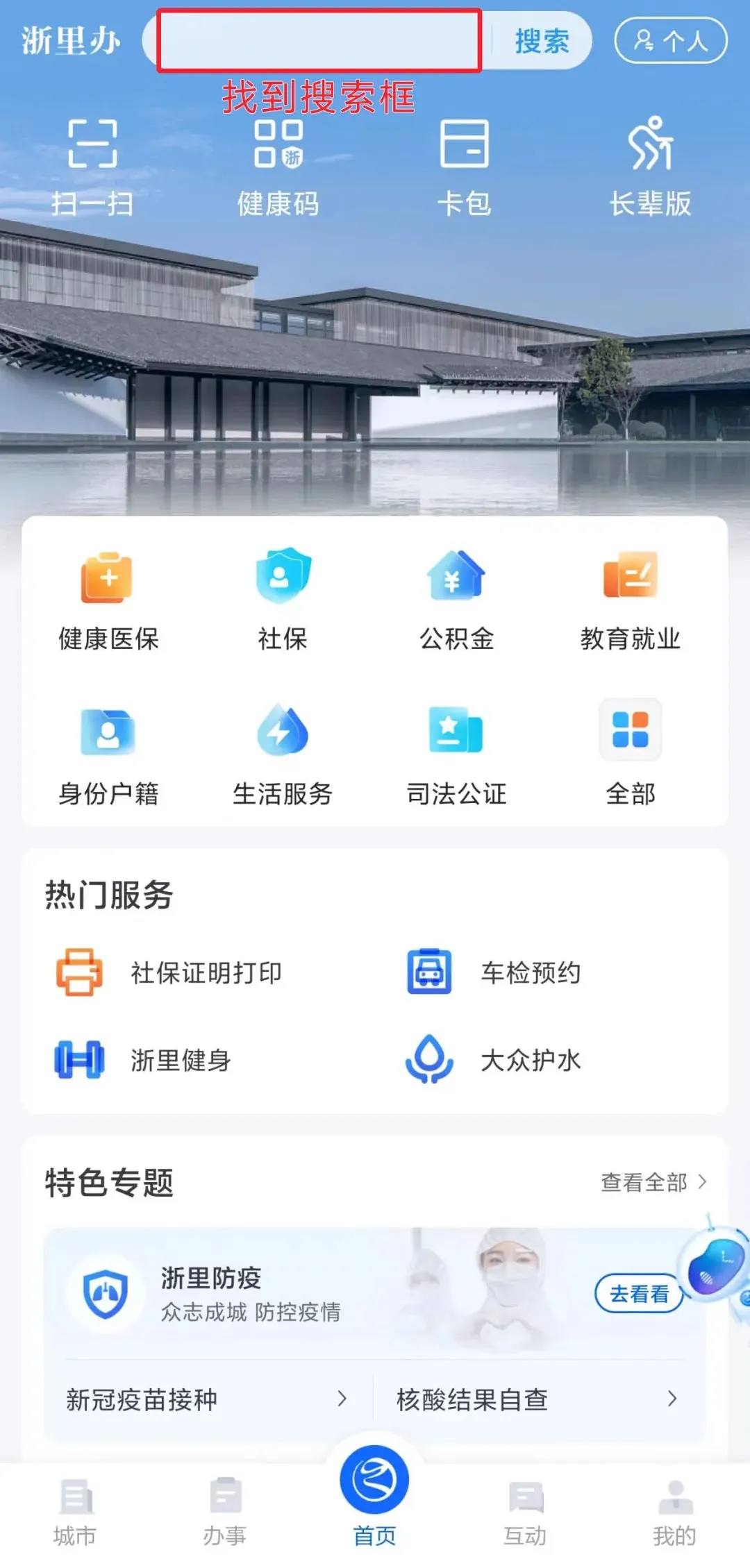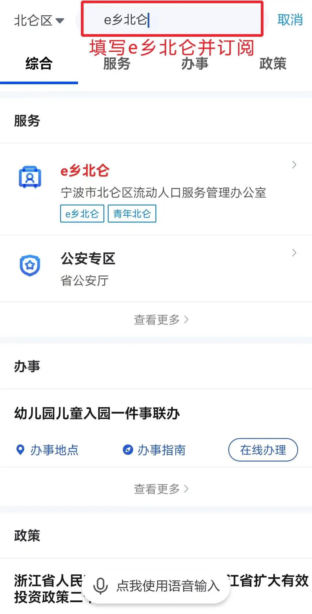 注册完成浙里办APP后,返回APP首页,在顶部的搜索框输入“e乡北仑”进行查找并点击订阅,然后点击进入e乡北仑专题。