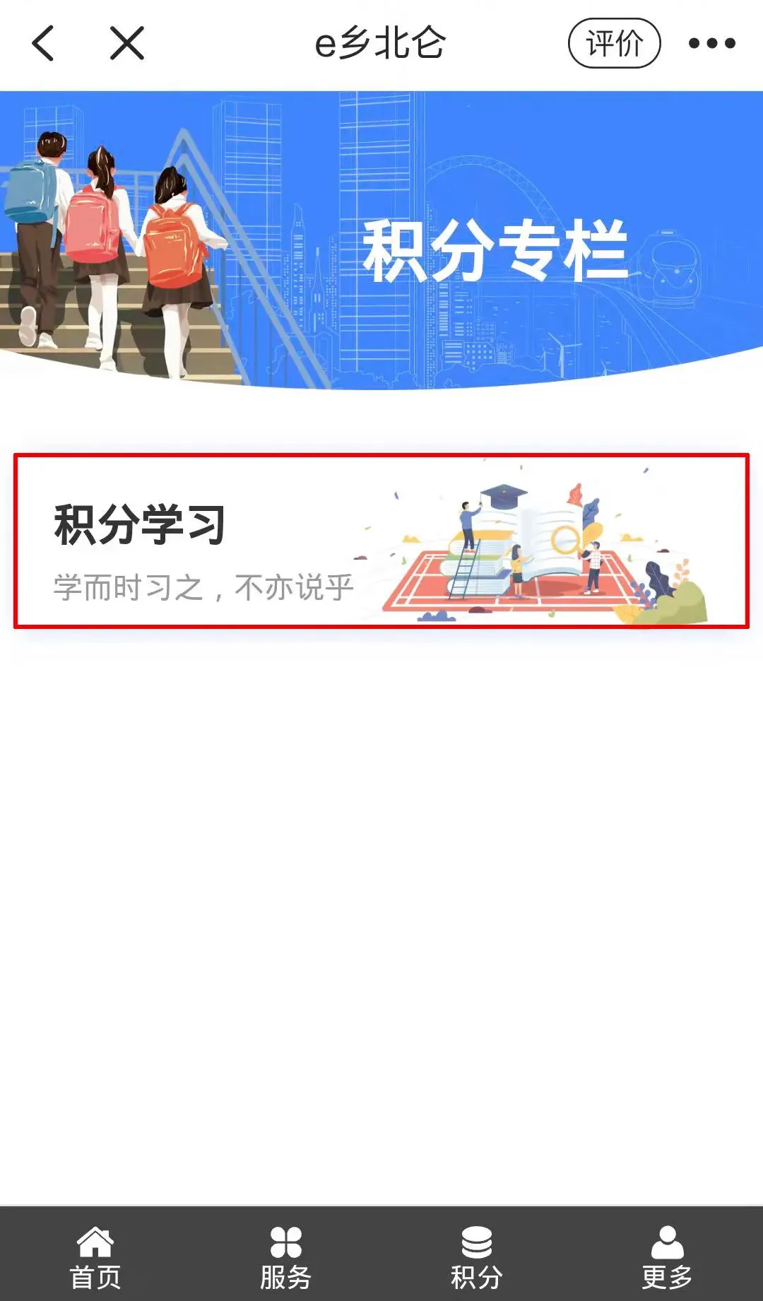 进入e乡北仑后,点击底部“积分”,并进行实名信息认证,通过后可进入积分模块,开始积分学习课件的考试。