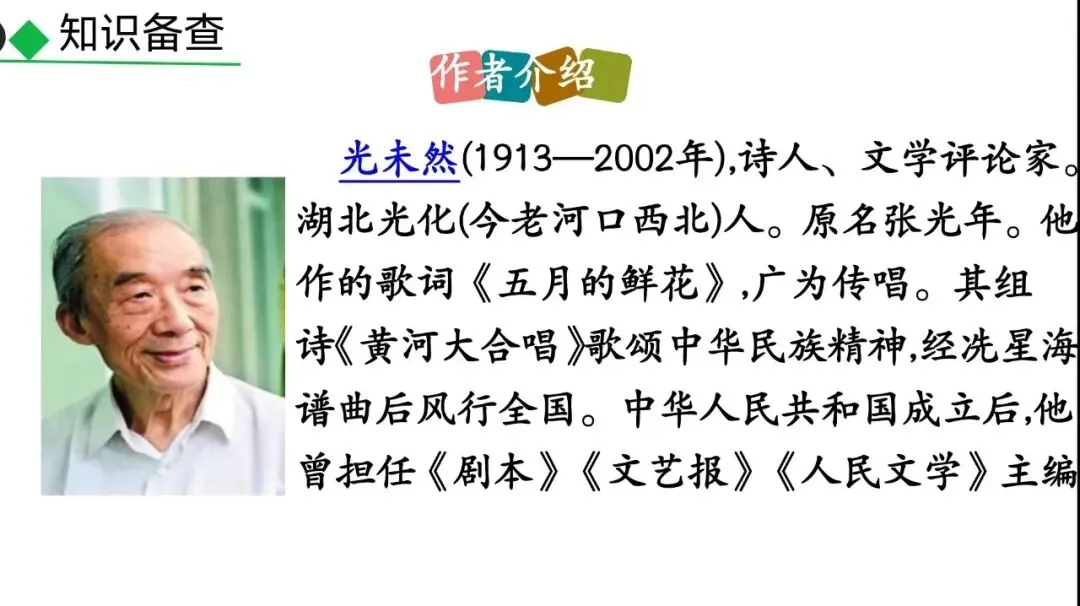 《黄河大合唱》是诗人光未然为配合音乐家冼星海创作的大型民族交响乐而写的组诗,《黄河颂》是其中的的第二章。这是一首歌词,也是一首反映抗日救亡主题的现代诗,以颂歌的形式塑造黄河形象,歌颂中华民族的伟大精神。
