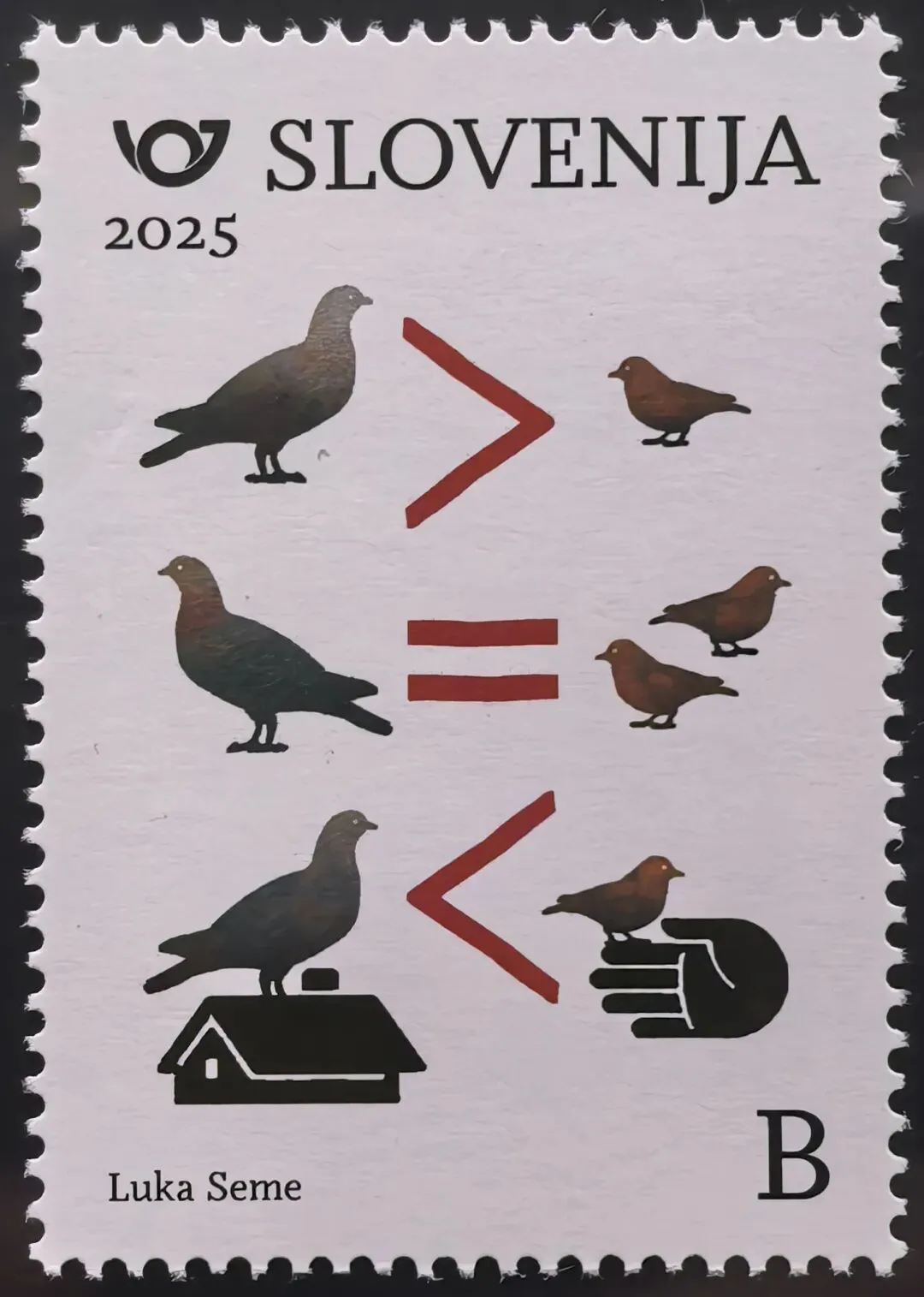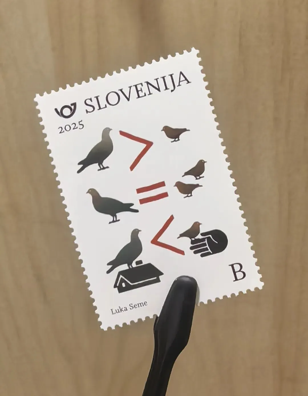 与本科生研讨教学设计的方法时,我强调在高一授课中要敢于对教材进行大胆取舍,课件设计也要遵循“少即是多”的原则。但我察觉到,大多数缺乏实践经验的同学其实并不真正理解这一点——他们会疑惑:取舍教材内容,难道不怕遗漏知识点吗?课件内容又怎么可能做到“少即是多”呢?我由此想到了斯洛文尼亚2025年发行的谚语邮票 “手中的麻雀胜过屋顶上的鸽子”。这句流传已久的斯洛文尼亚谚语,不仅蕴含着知足常乐的人生哲学,更为我们反思课件设计与制作提供了一面清晰的镜子。