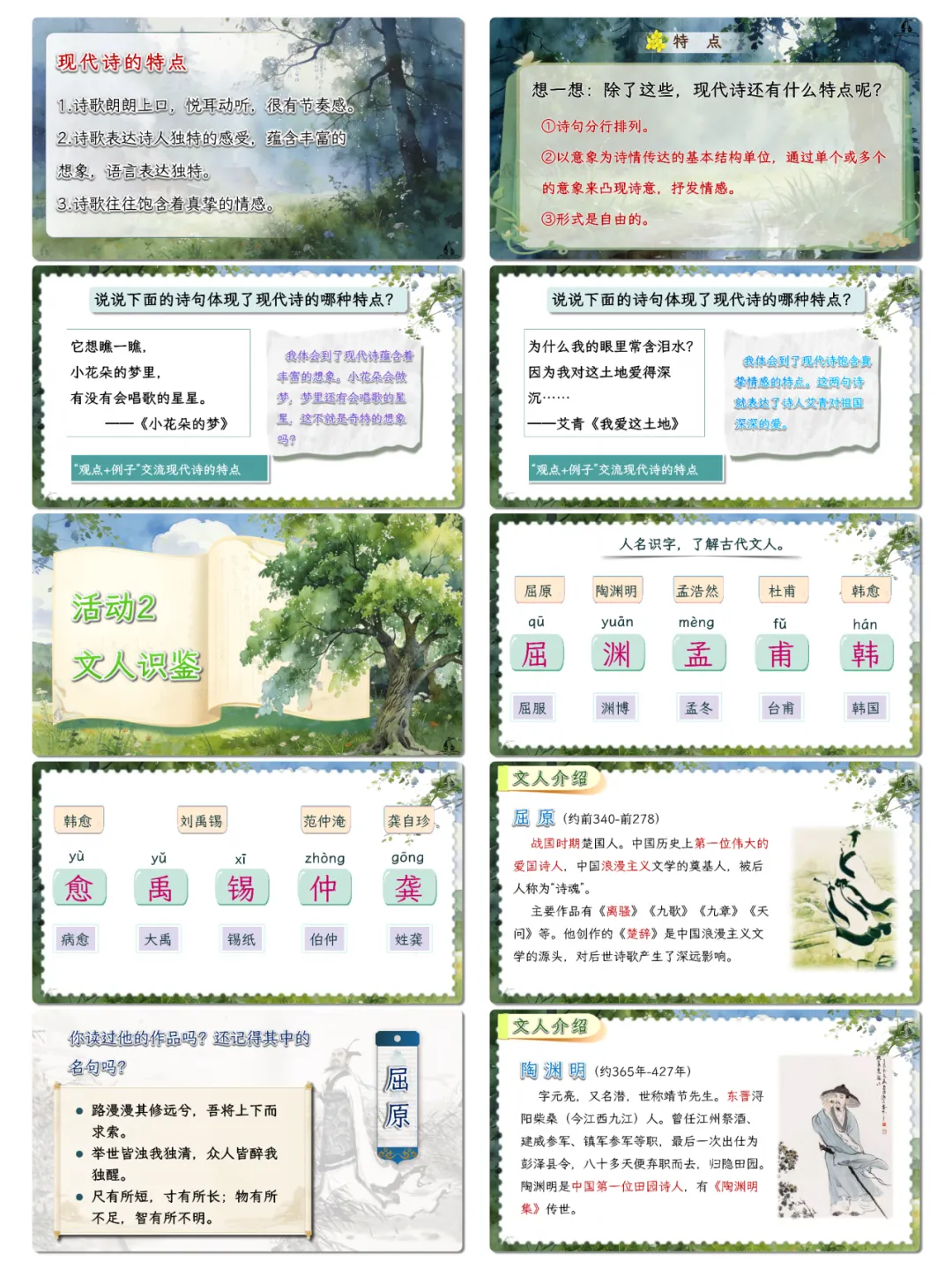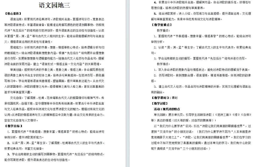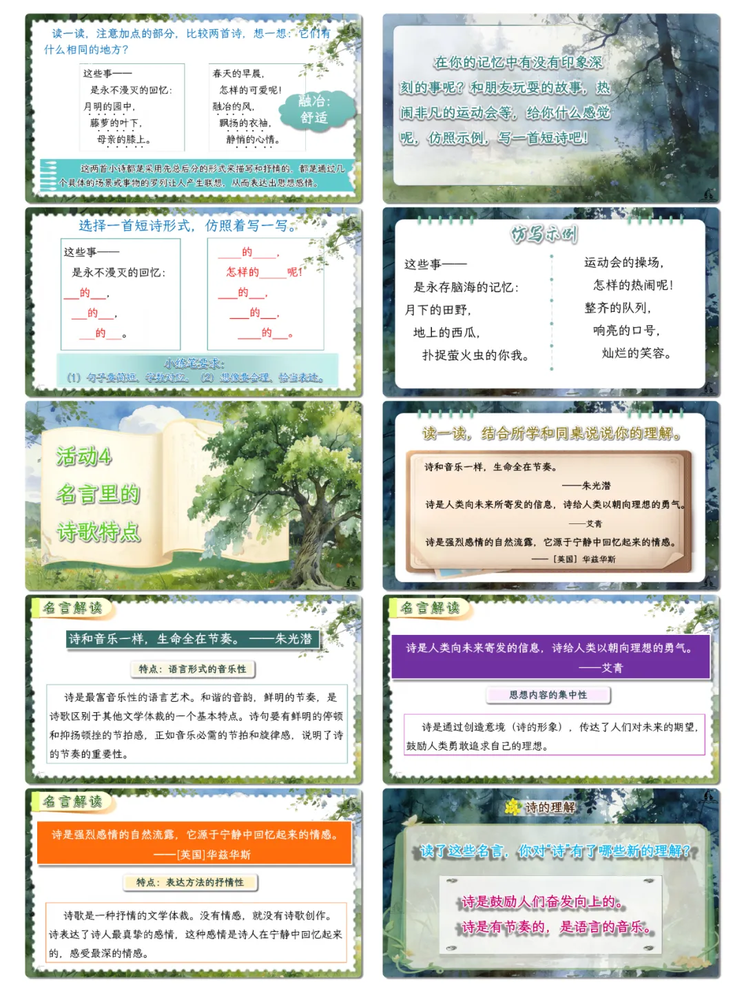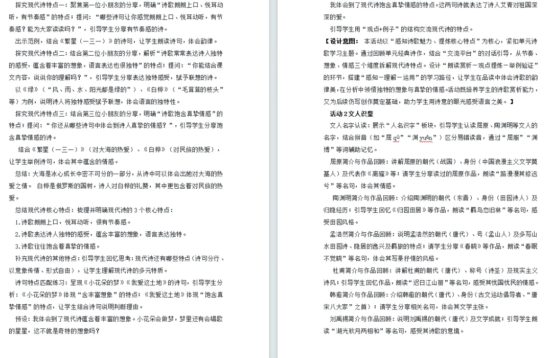 语言运用:积累现代诗经典诗句、诗歌相关名言,掌握诗句分行、意象表达等诗歌语言特点,丰富语言储备。能精准运用描写颜色的短语刻画事物,仿照现代诗“先总后分”的结构进行短诗创作,提升语言表达的生动性与创造性。认读并掌握“屈、渊、孟”等与古代文人相关的生字,能结合语境理解诗句与名言含义,增强语言运用的灵活性与准确性。