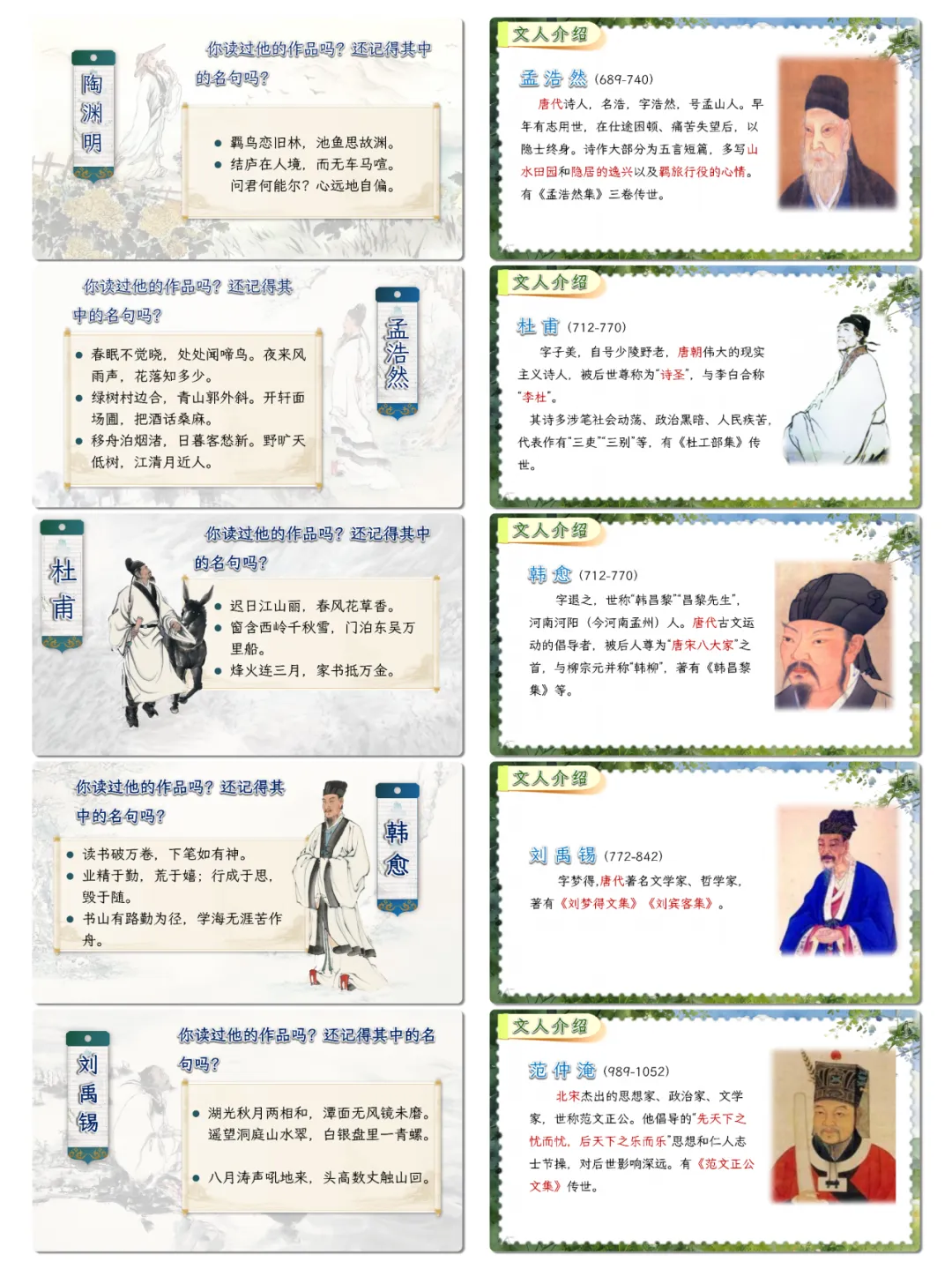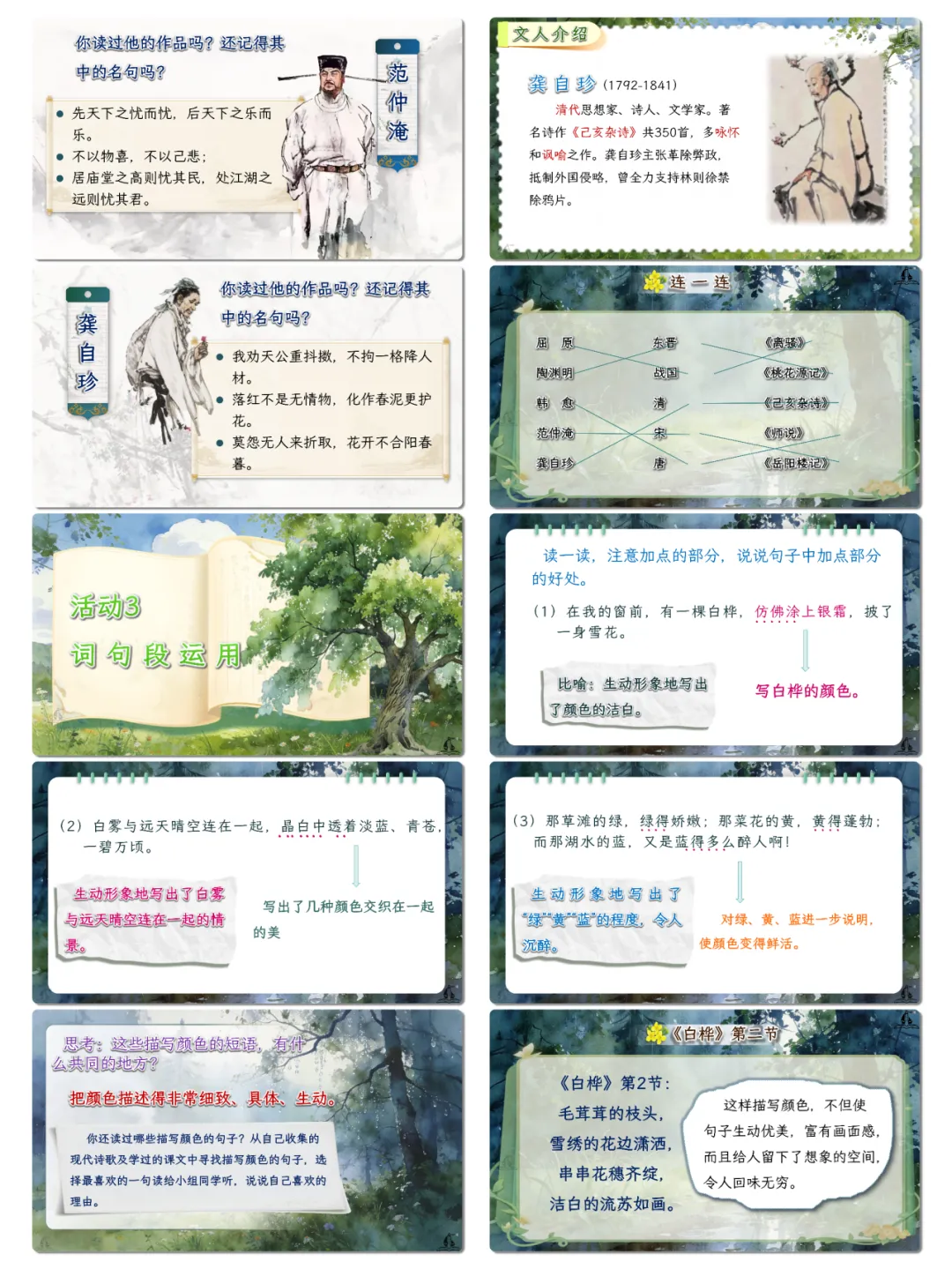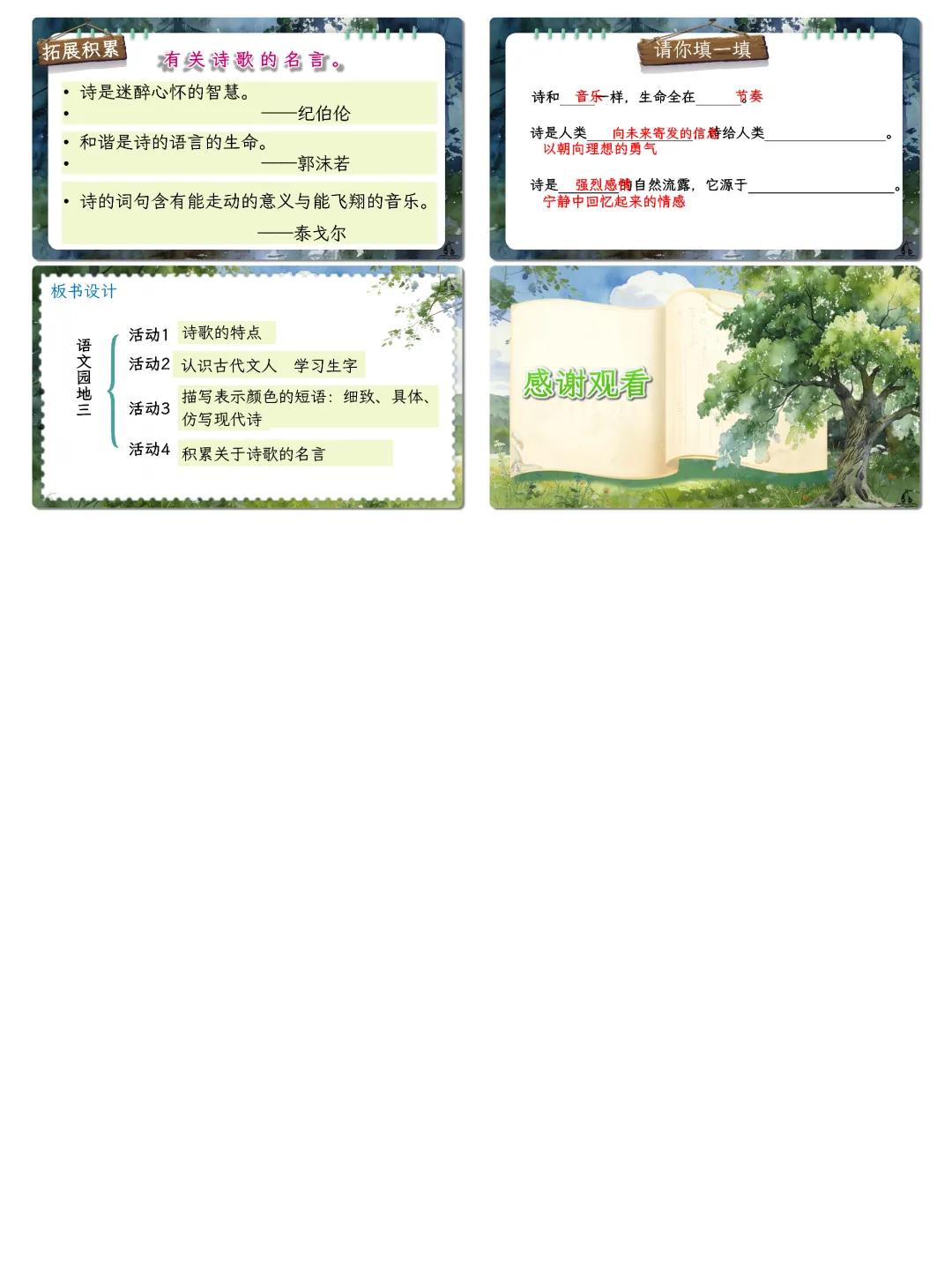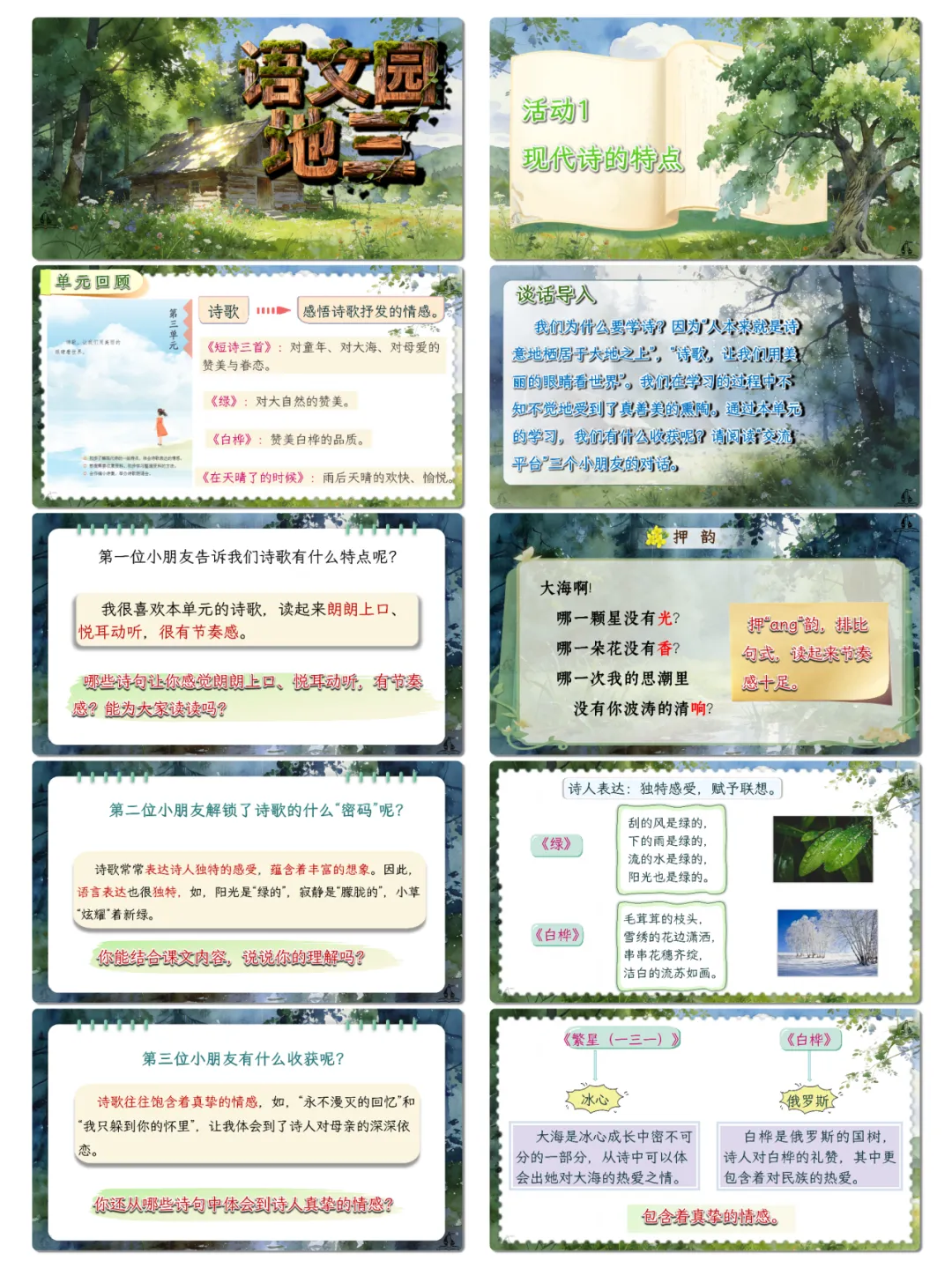 语言运用:积累现代诗经典诗句、诗歌相关名言,掌握诗句分行、意象表达等诗歌语言特点,丰富语言储备。能精准运用描写颜色的短语刻画事物,仿照现代诗“先总后分”的结构进行短诗创作,提升语言表达的生动性与创造性。认读并掌握“屈、渊、孟”等与古代文人相关的生字,能结合语境理解诗句与名言含义,增强语言运用的灵活性与准确性。