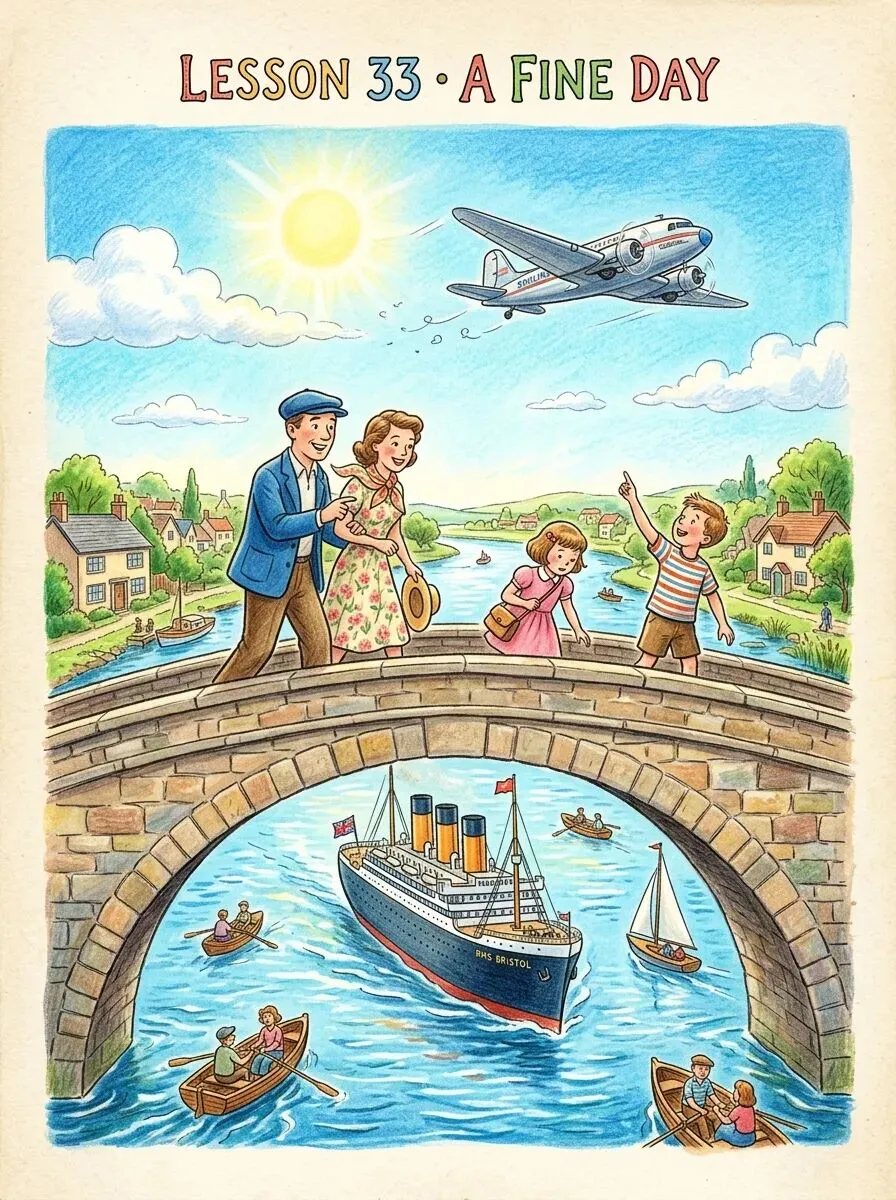 The concept of a "fine day" is subjective and culturally influenced. In the UK, a day without rain, even if partly cloudy, is often welcomed as "fine" or "lovely". The text depicts a scene of leisure, but it also subtly shows the different focuses within a family unit. The parents observe the general scenery ("some boats"), the daughter focuses on a specific large object ("a big ship"), and the son is captivated by the technological marvel in the sky ("an aeroplane"). This mirrors how individuals, even in a shared activity, engage with their environment based on personal interest. The present continuous tense masterfully creates a snapshot, freezing this harmonious moment in time where nature, simple technology (boats, bridge), and modern technology (aeroplane) coexist peacefully.