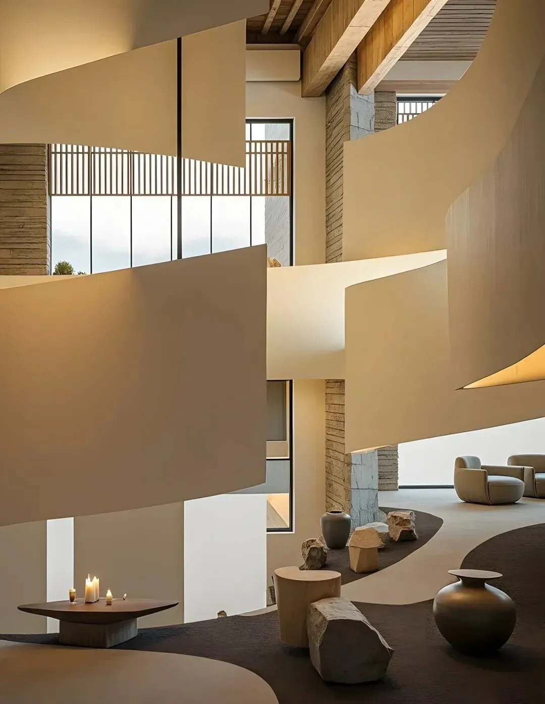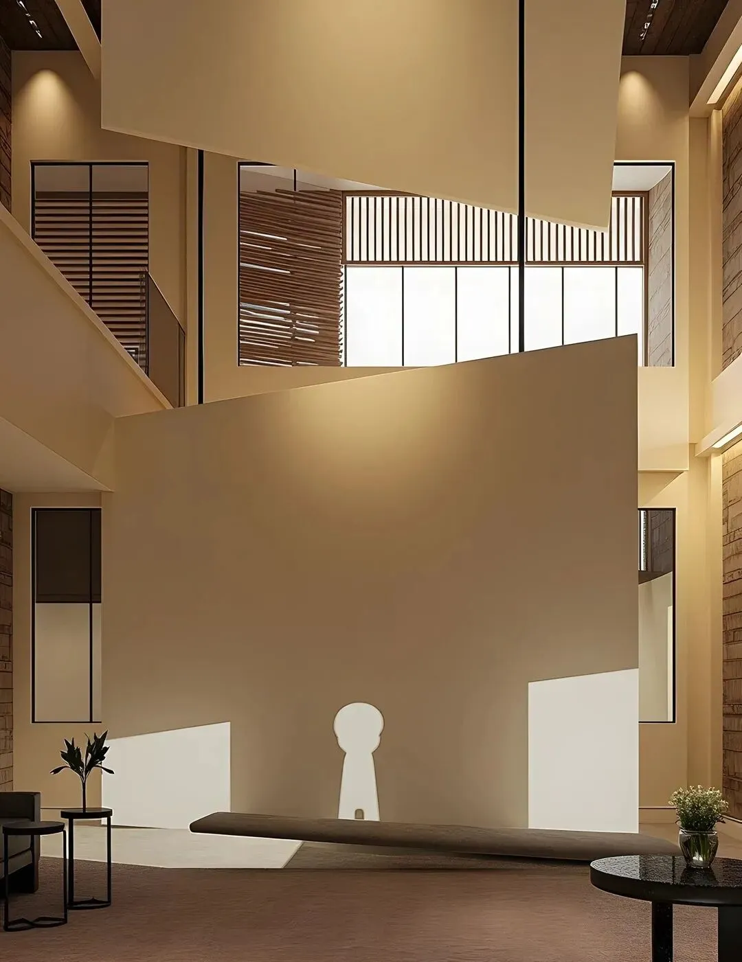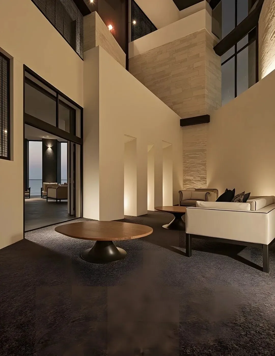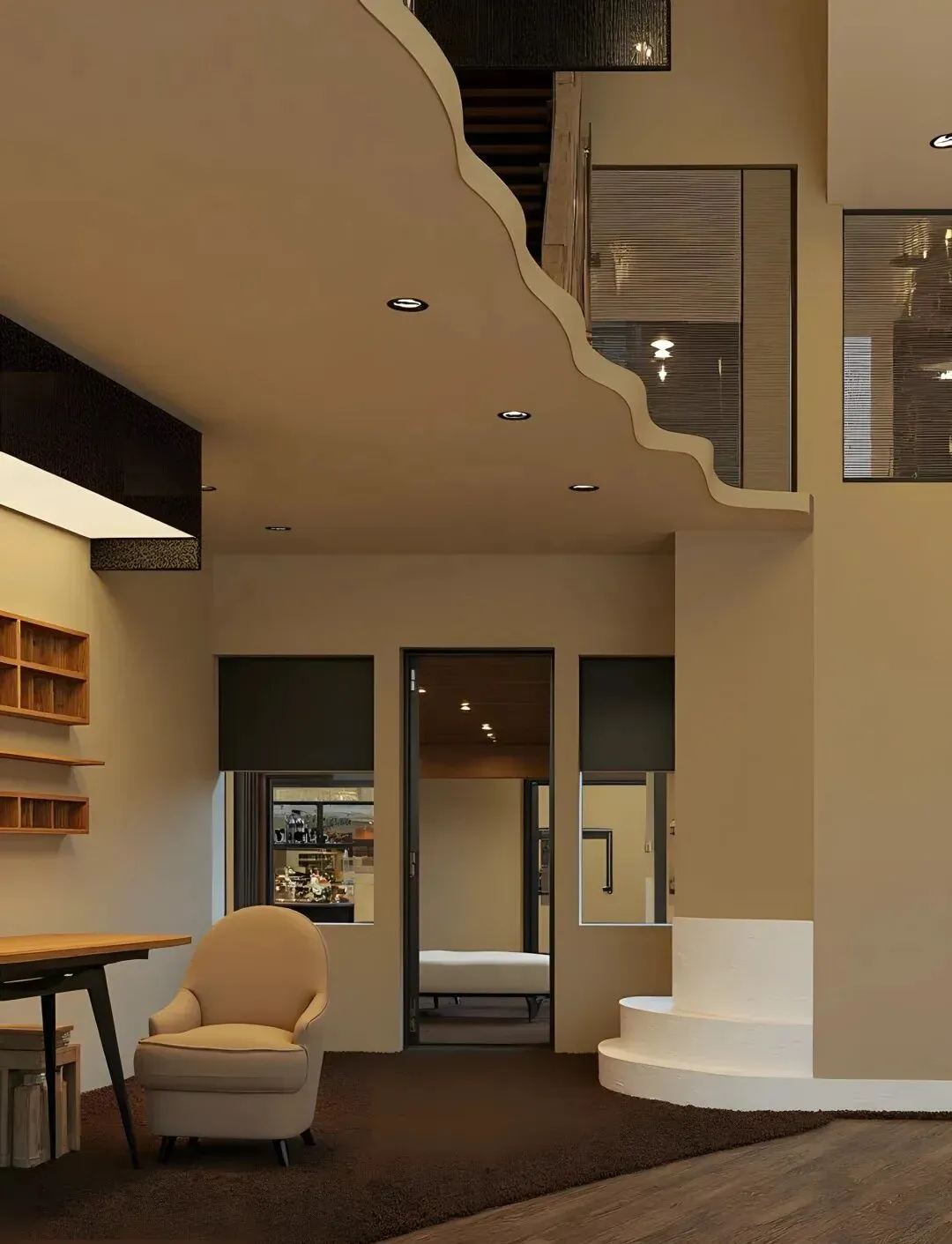 走进内部,柔和的灯光勾勒出建筑线条,每一处角落都像是精心雕琢的艺术品。沙发、茶几的摆放随性而又不失格调,静默的诉说着慵懒与惬意。尤其是那有着独特光影效果的区域,像是打开了通往宁静的任意门。