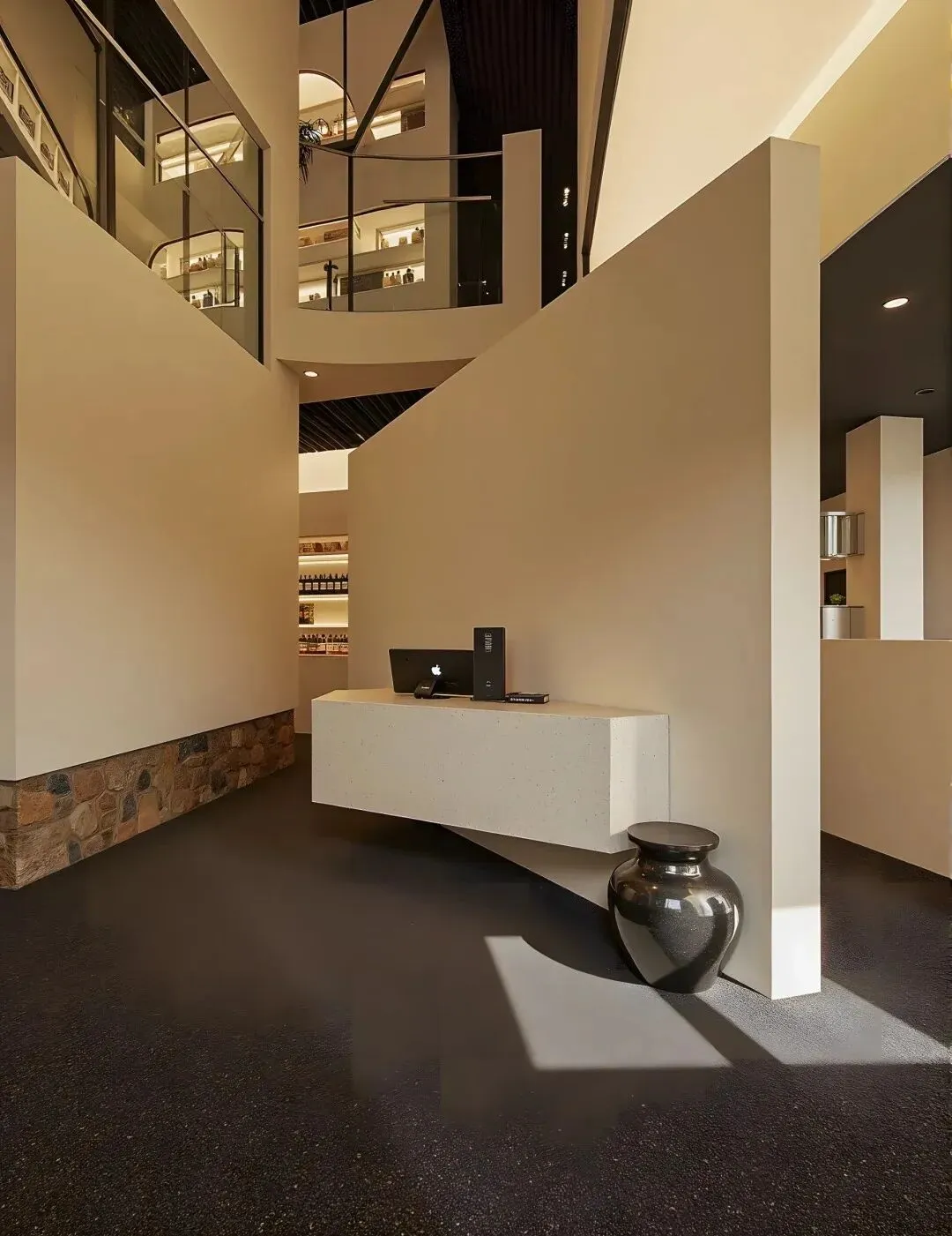 进入养生疗愈空间,整个被震撼住!简约又极具设计感的前台,搭配质感满满的黑色陶罐,瞬间抓住人的眼球。不规则的墙体设计,巧妙划分空间,高级感拉满。