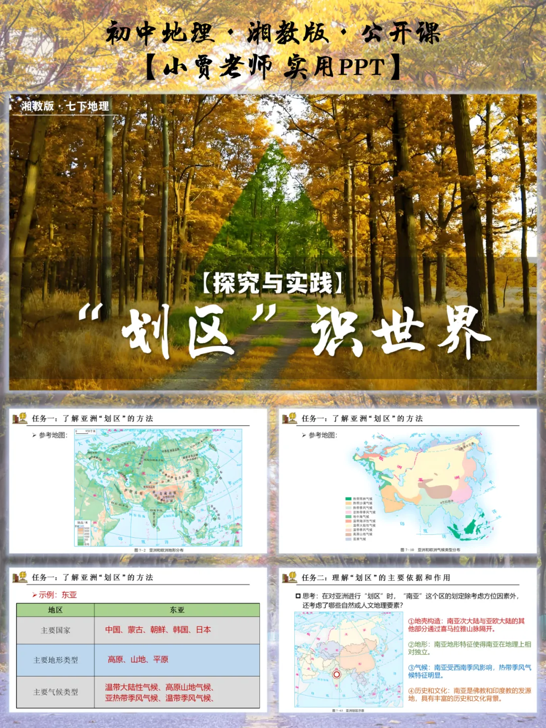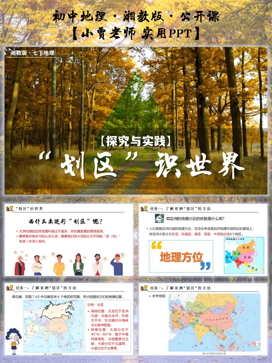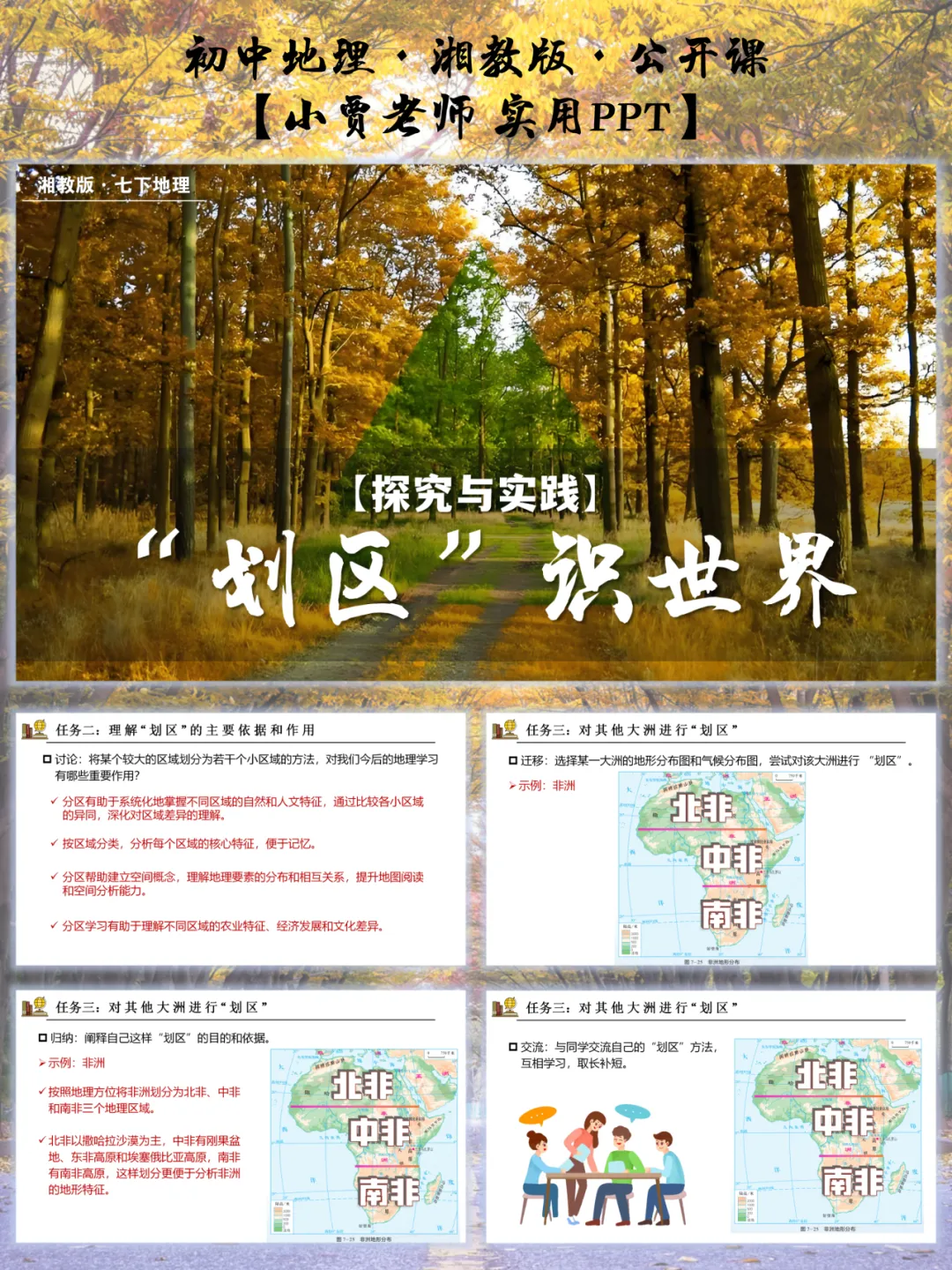 今日重点推荐湘教版七下地理《探究与实践——“划区”识世界》20页精品课件聚焦教学实效。
