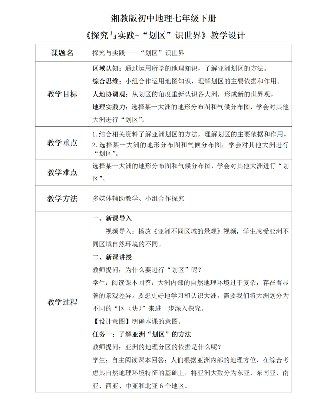 教学过程遵循“提出问题 — 学习方法 — 探究依据 — 实践运用”的认知逻辑,从基础的亚洲划区方法学习,到深层的划区依据探究,再到跨大洲的实践迁移,难度逐步提升,贴合七年级学生由浅入深的地理思维发展规律,让学生的探究过程有章法、有层次。