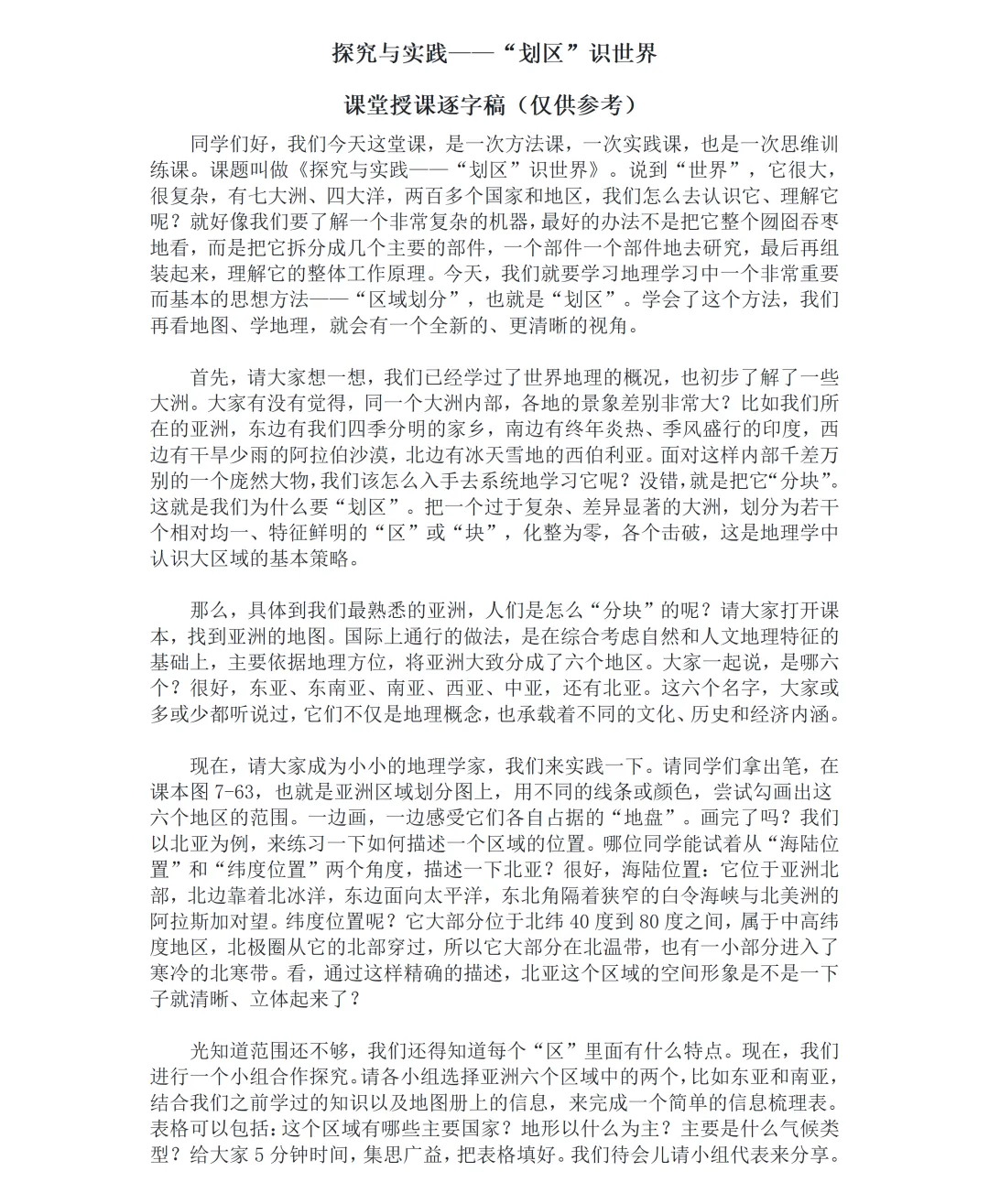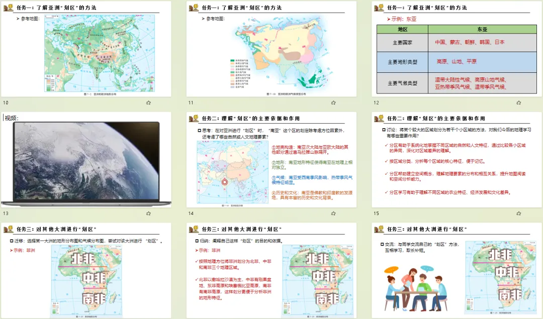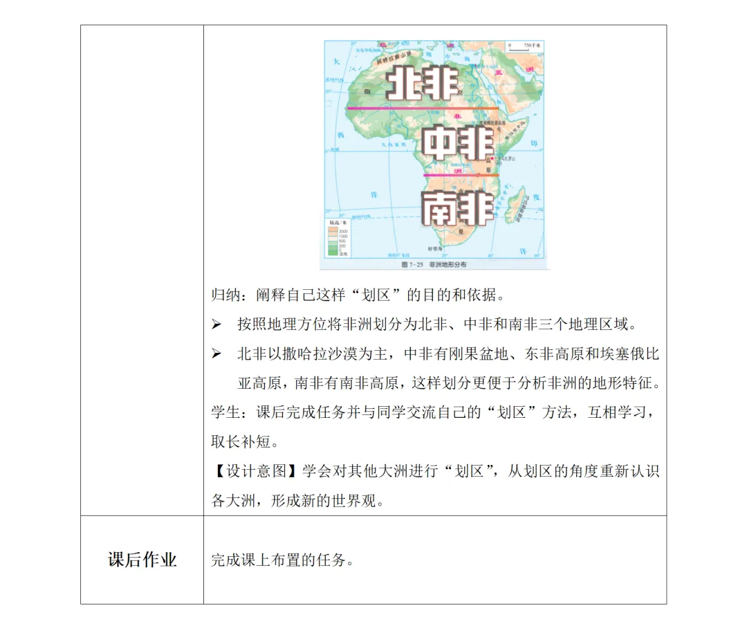 以学生已学的亚洲为核心范例,让学生在熟悉的区域中掌握划区方法,再以非洲为示范、其他大洲为实践对象,实现 “从已知到未知” 的知识迁移,让学生能将课堂所学的划区思路,灵活运用到其他大洲的地理学习中,培养地理知识的运用能力。