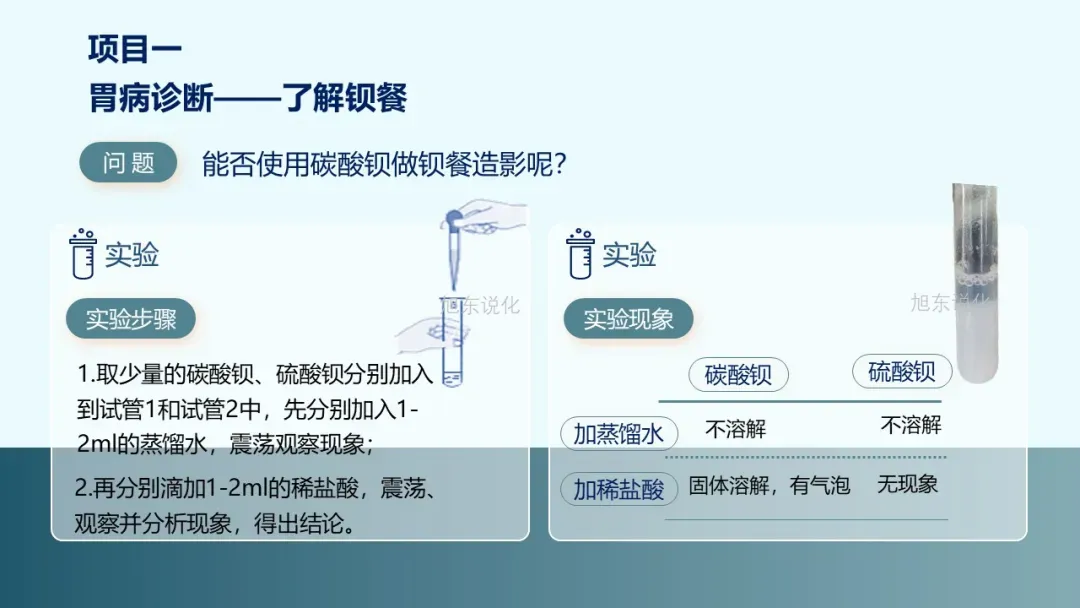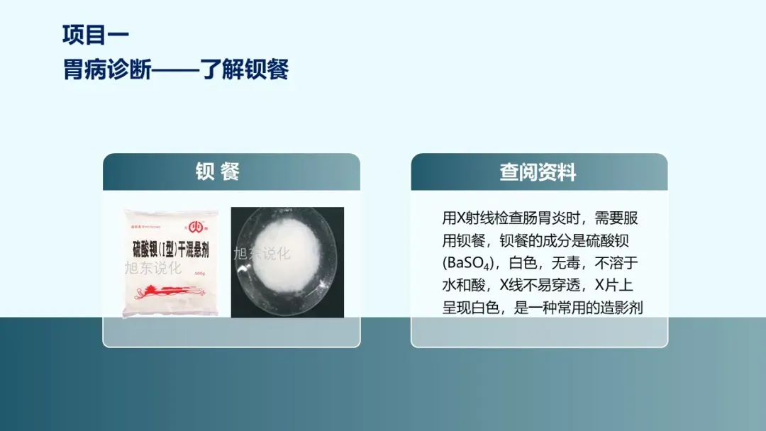 [学生]通过网络查找相关文献并进行整理和归纳:当胃病患者进行X 射线检查时,需要服用钡餐。钡餐的成分是硫酸钡(BaSO4),白色,无毒,不溶于水和酸。硫酸钡不易被X线穿透,X片上会呈现白色,是一种常用的造影剂。