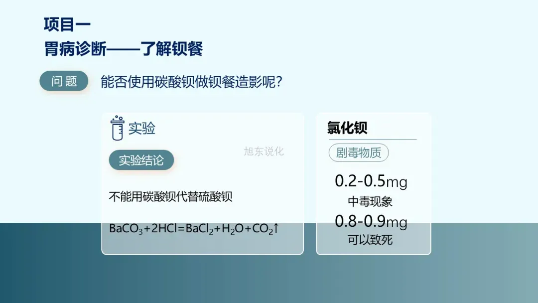 [教师]氯化钡是剧毒物质,人体摄入0.2~0.5 mg会出现中毒现象,摄入0.8~0.9 mg就可以致死。碳酸钡溶于胃液会产生氯化钡,有毒!不能用碳酸钡做钡餐造影。