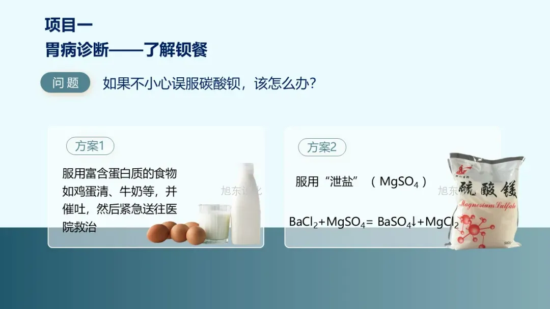 [教师]氯化钡使人中毒的根本原因是钡离子与人体蛋白质发生作用。如果不小心误服碳酸钡怎么办?请各小组讨论,并结合课前查阅的文献制定急救方案。
