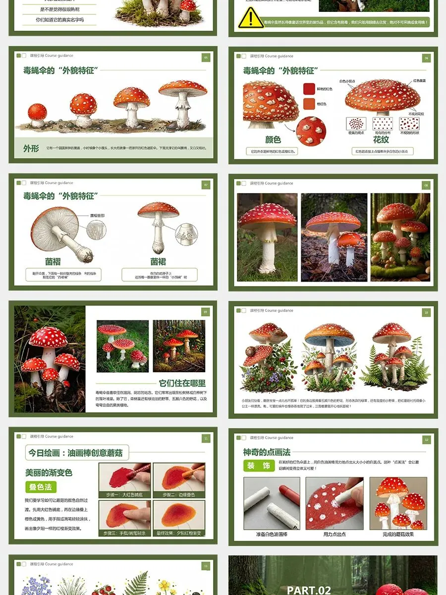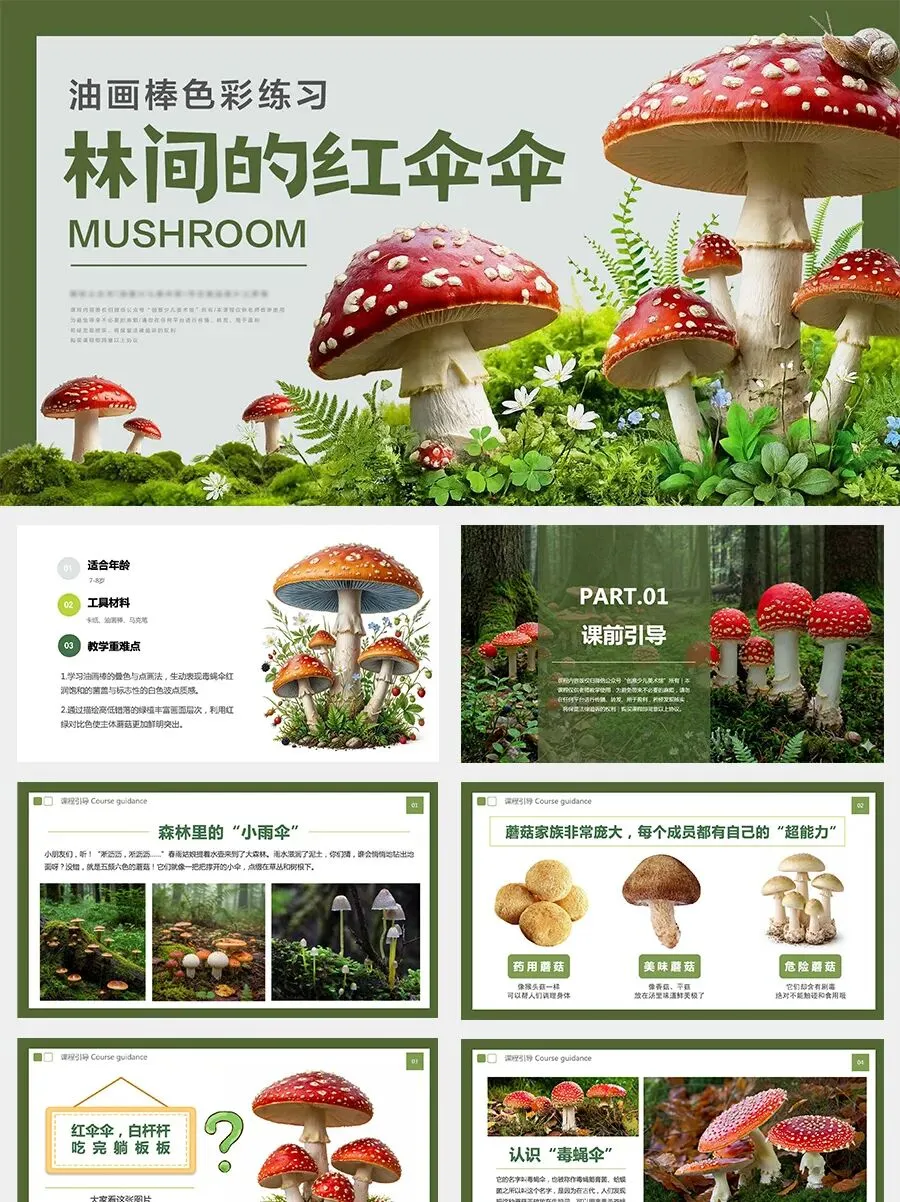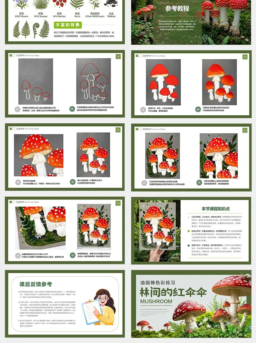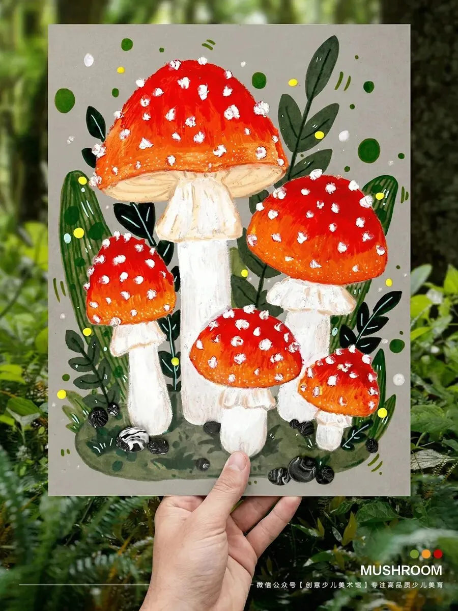 虽然我们不能在野外触摸它,但今天我们可以用手中的油画棒,画出它那种鲜明夺目的危险感。准备好了吗?让我们拿起油画棒,一起走进这个色彩斑斓又带点神秘感的蘑菇世界吧!