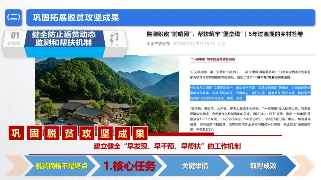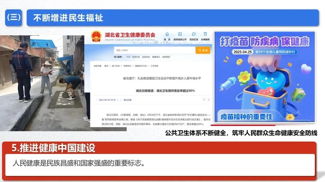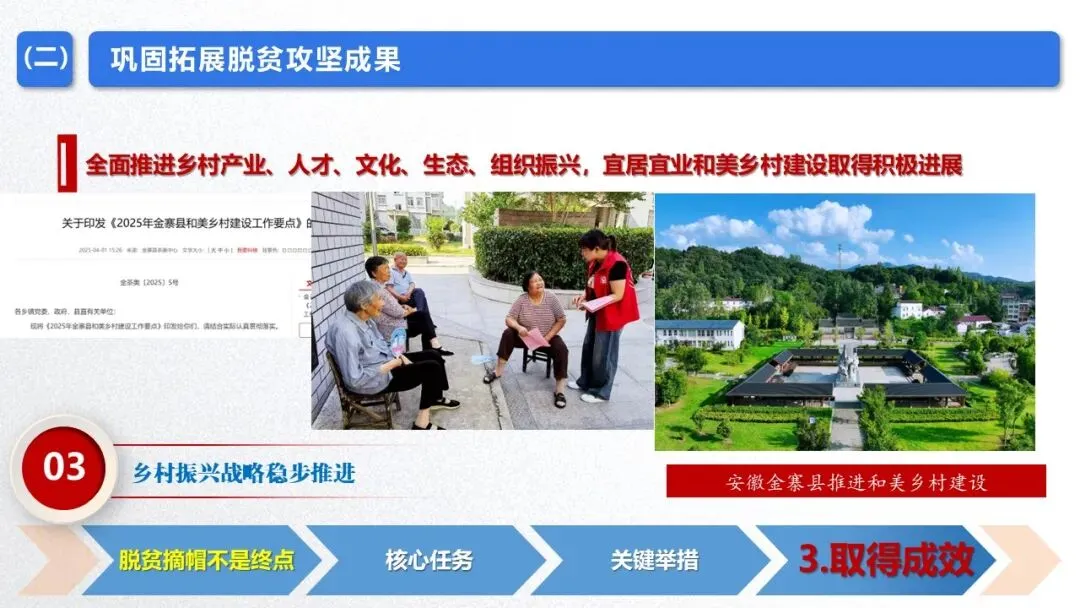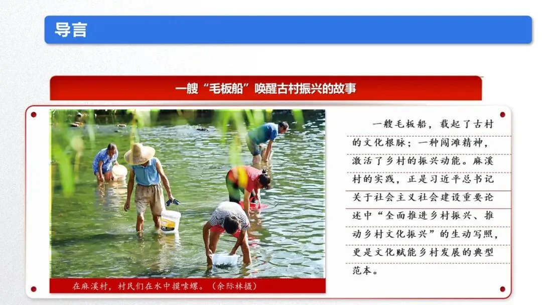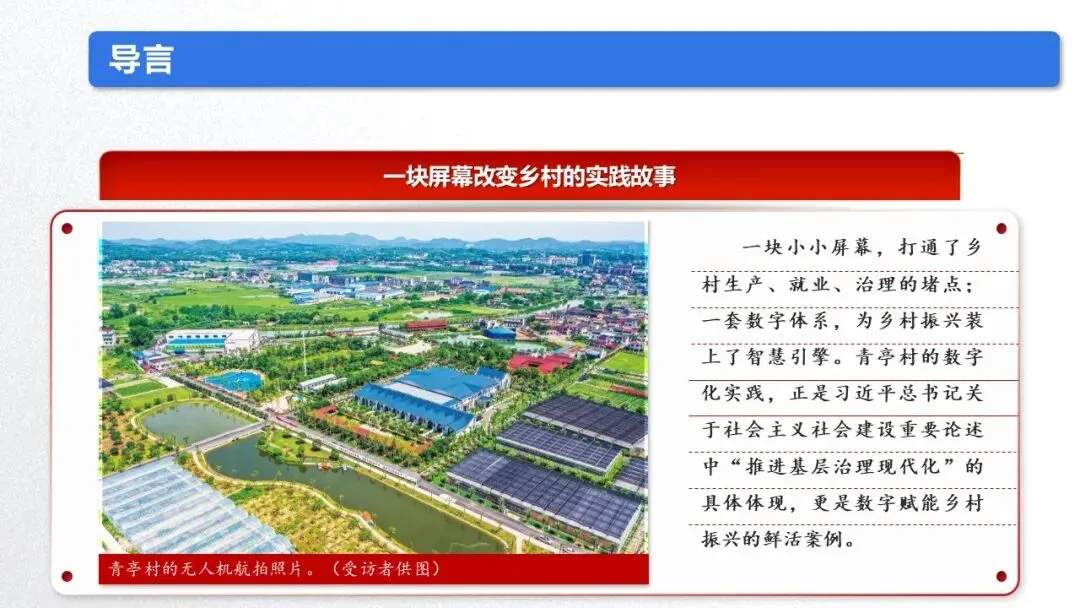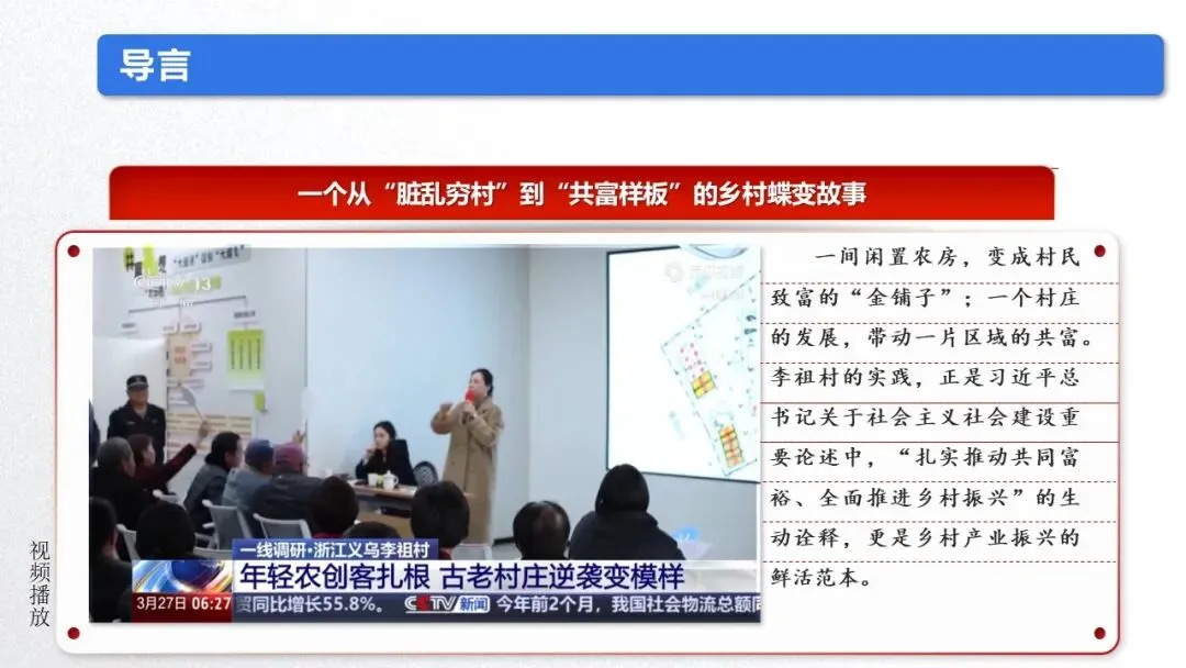 宣讲内容通过新华网发布的三个典型实例导入,一是“脏乱穷村”到“共富样板”的乡村蝶变故事;二是一块屏幕改变乡村的实践故事;三是一艘“毛板船”唤醒古村振兴的故事。接下来引入“十五五”规划纲要相关部署,采用常规的发展背景、核心要义、实践路径三层面深入阐述,有理论交流,也有案例分享。