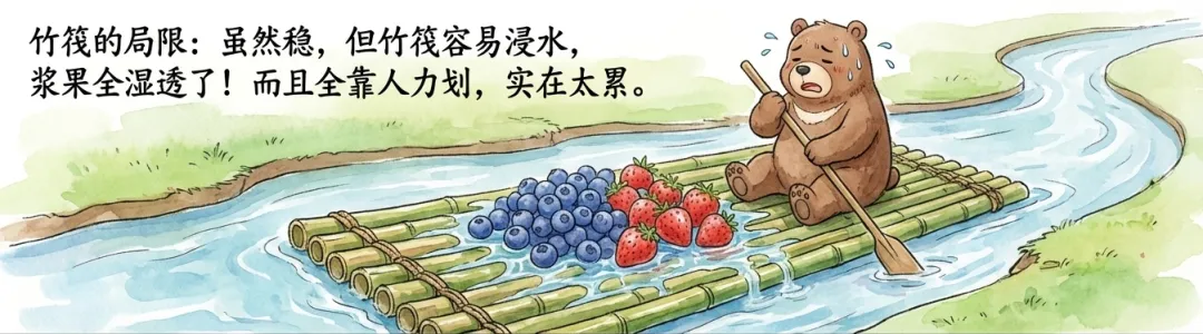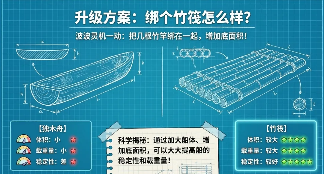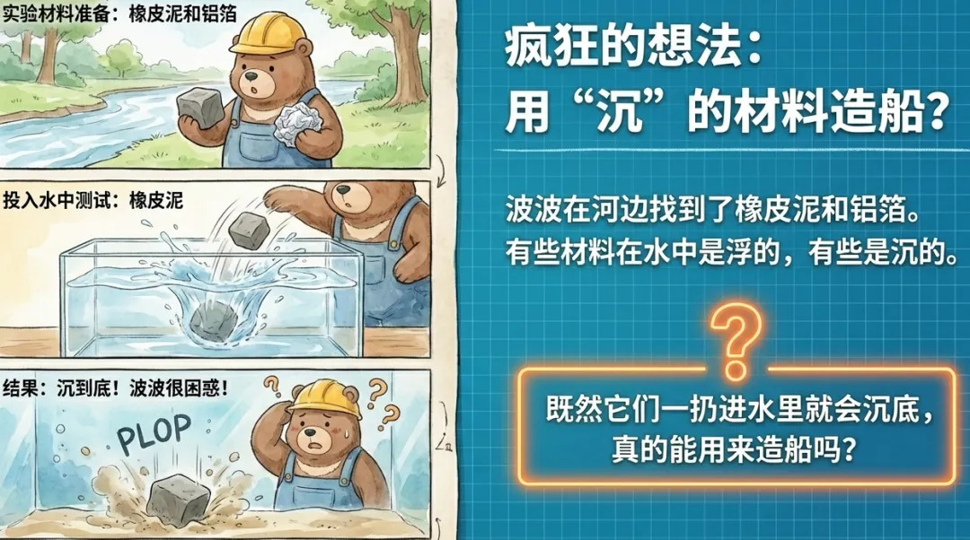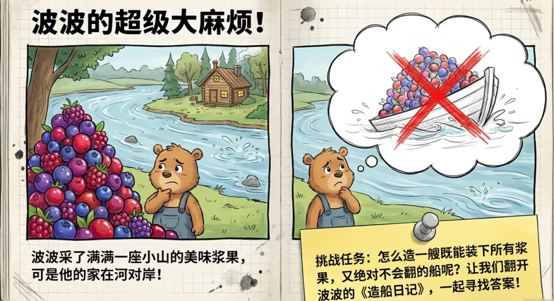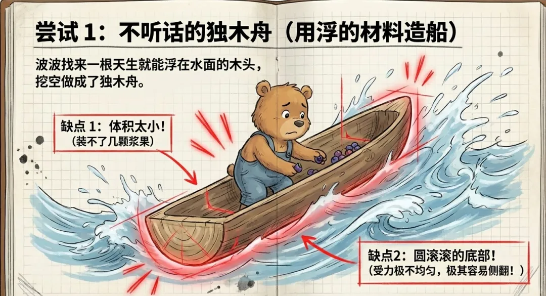 原教材中,“浮的材料造船”与“沉的材料造船”分属两课时,容易让学生形成割裂的认识。我以“波波运浆果”的真实问题为驱动,将两节课整合为一条任务链:先用浮的材料(木头)造独木舟,发现稳定性与载重量的局限。