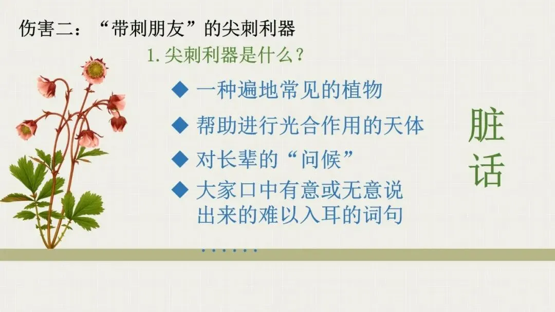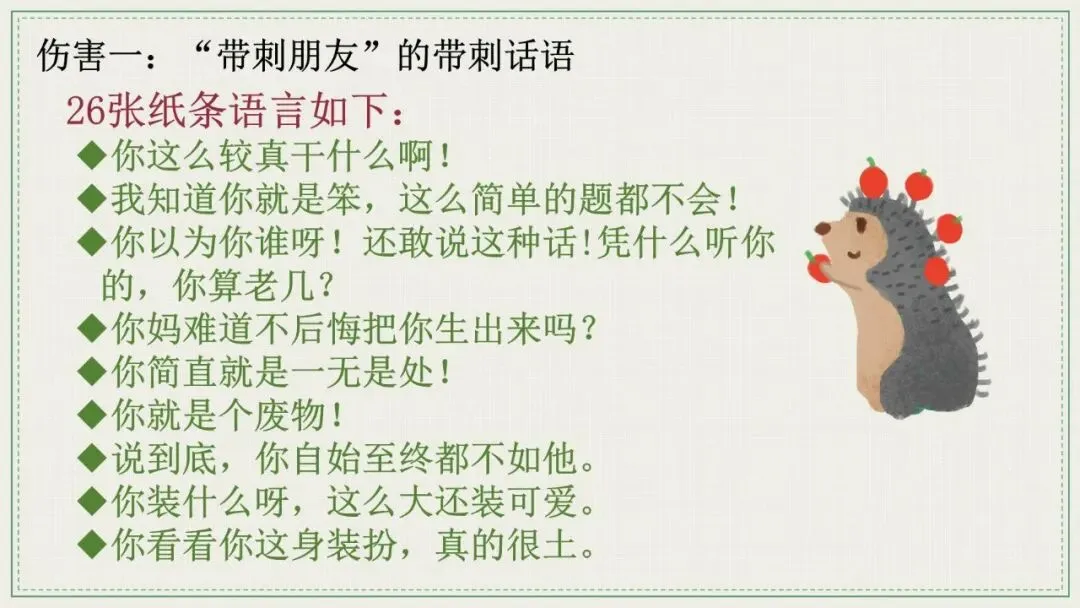 📖 班会流程设计:✅ 情境导入:“小松鼠”要攻略“小刺猬”——激发学生参与感✅ 伤害一:26句“带刺话语”现场抽取朗读——让学生听见平时忽略的伤人语言✅ 伤害二:讨论“尖刺利器”(脏话)的成因、危害与发展三阶段✅ 方法一:“软化”你的刺——低情商vs高情商话术对比修改练习✅ 方法二:拔掉你的刺——禁忌词替换法、反话正说法、走心沟通法✅ 方法三:强大内心——树立自信、敢于表达不适、关注自身可控之事✅ 教师寄语:别让戾气掌控你的心,屠龙少年不做被屠的恶龙