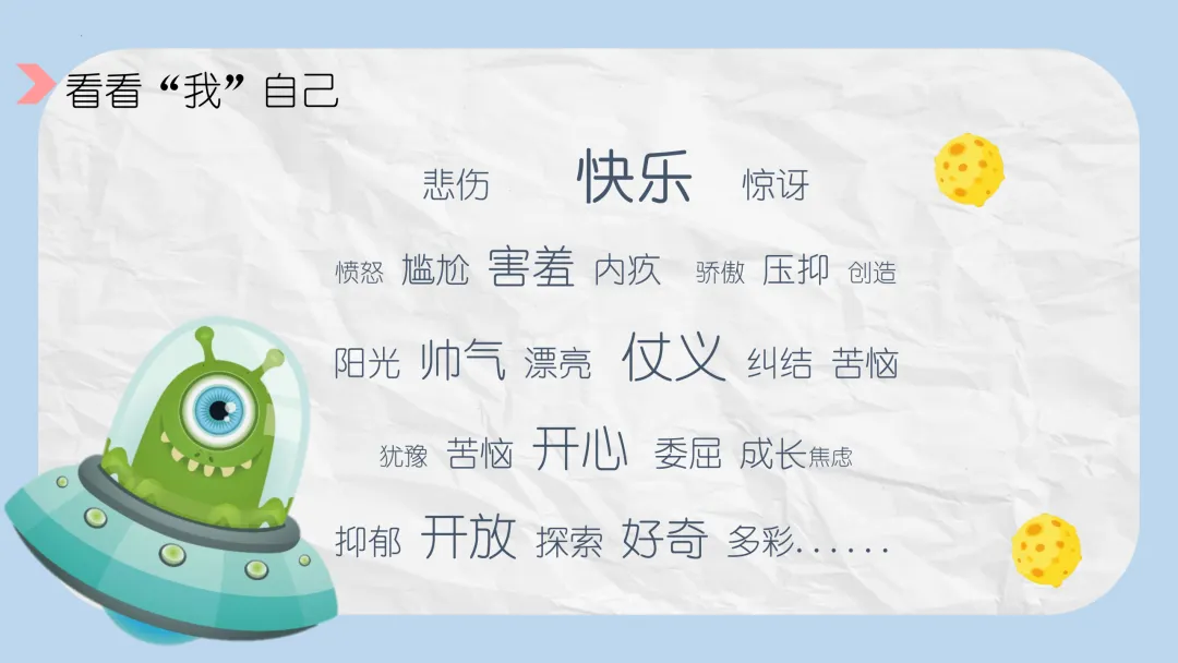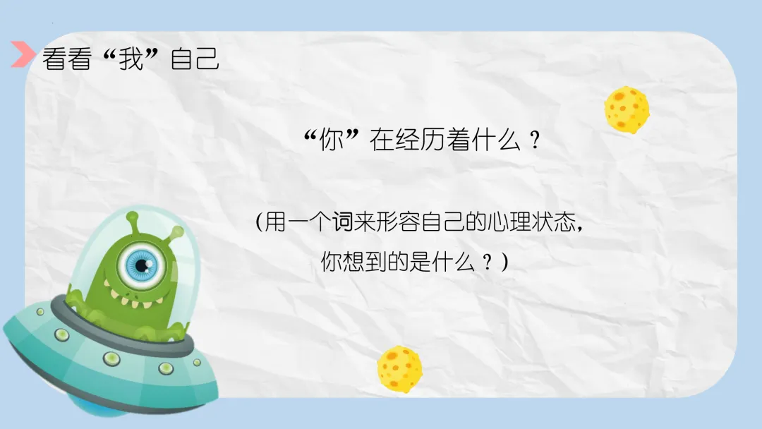 - 教师提问:“用一个词来形容你现在的心理状态,你想到的是什么?”