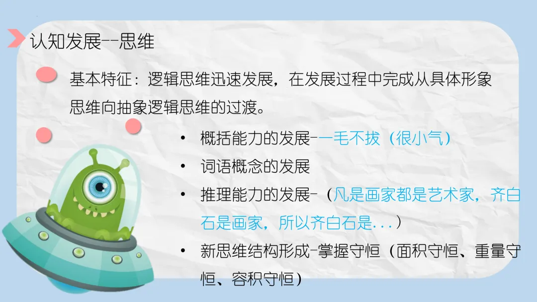 - 思维发展: 从具体形象思维向抽象逻辑思维过渡(如推理能力、掌握守恒概念)。