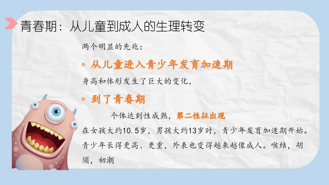 - 青春期的定义: 从儿童到成人的生理转变(女孩约10.5岁,男孩约13岁开始)。