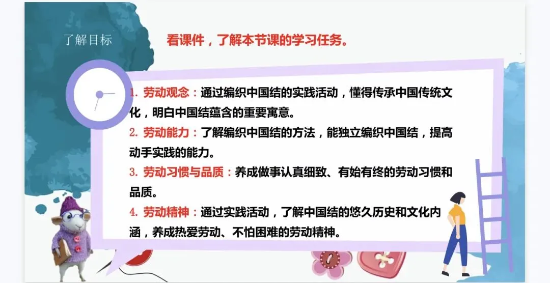1.劳动观念:通过编织中国结的实践活动,懂得传承中国传统文化,明白中国结蕴含的重要寓意。