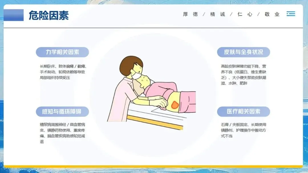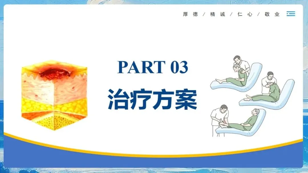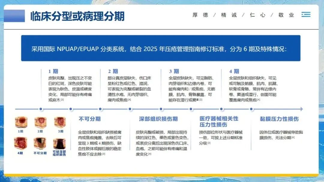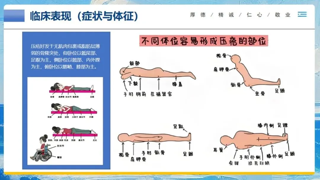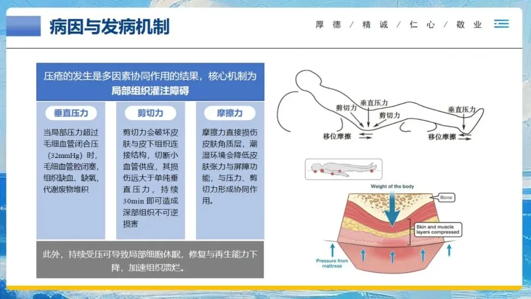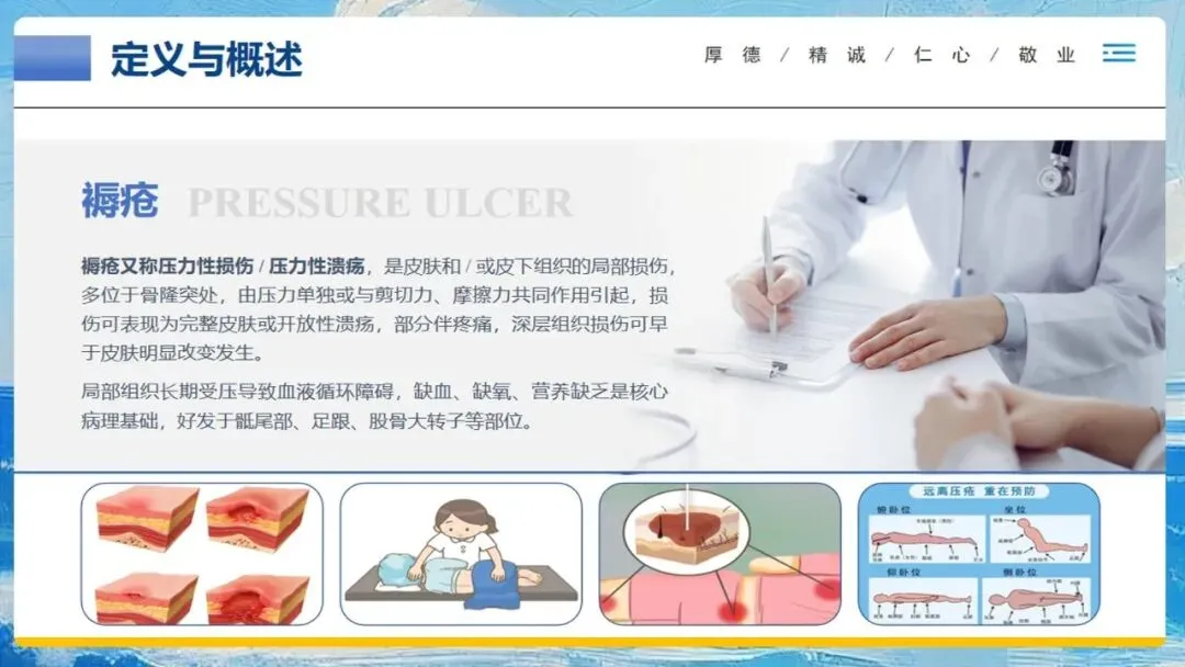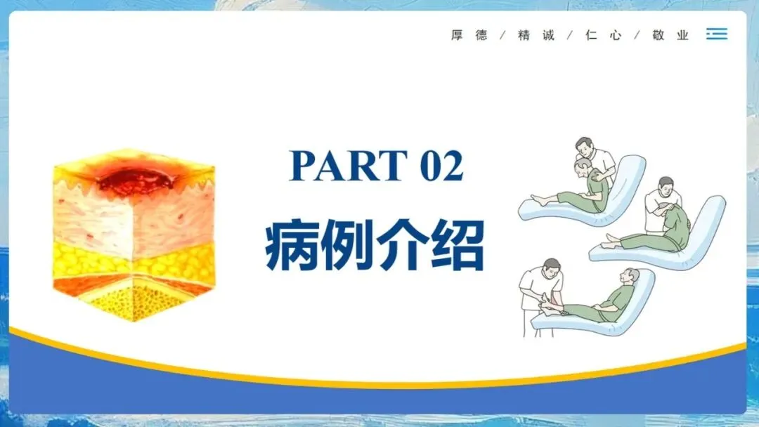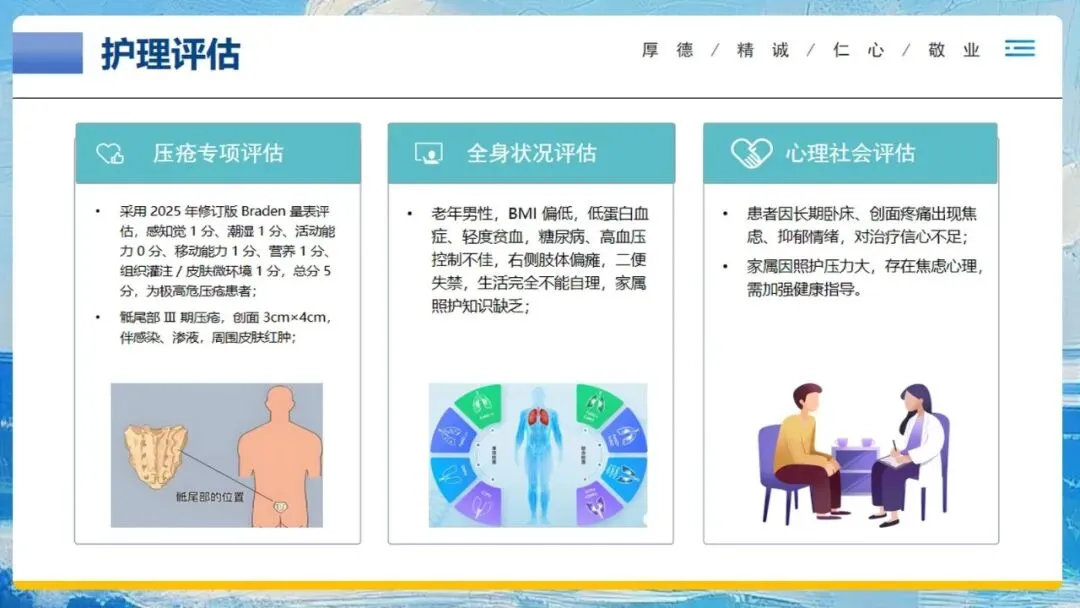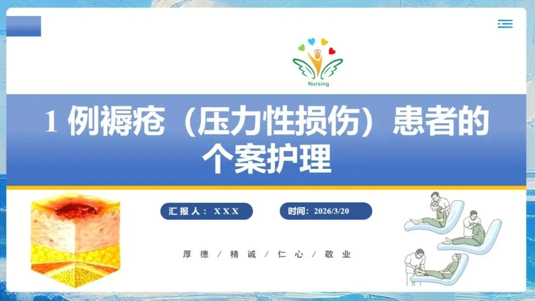 褥疮又称压力性损伤或压力性溃疡,是皮肤和/或皮下组织的局部损伤,多位于骨隆突处。它由压力单独或与剪切力、摩擦力共同作用引起,损伤可表现为完整皮肤或开放性溃疡,部分伴有疼痛,且深层组织损伤可能早于皮肤明显改变发生。其核心病理基础是局部组织长期受压导致血液循环障碍,引发缺血、缺氧和营养缺乏。常见好发部位包括骶尾部、足跟、股骨大转子等。该病症多见于长期卧床、坐轮椅等行动不便人群,早期识别与科学护理对预防其恶化至关重要。本次1 例褥疮(压力性损伤)患者的个案护理的分享,旨在通过真实病例解析压力性损伤的评估、分期及护理要点,提升团队对难愈性伤口的处理能力,强化预防意识,促进患者康复。
