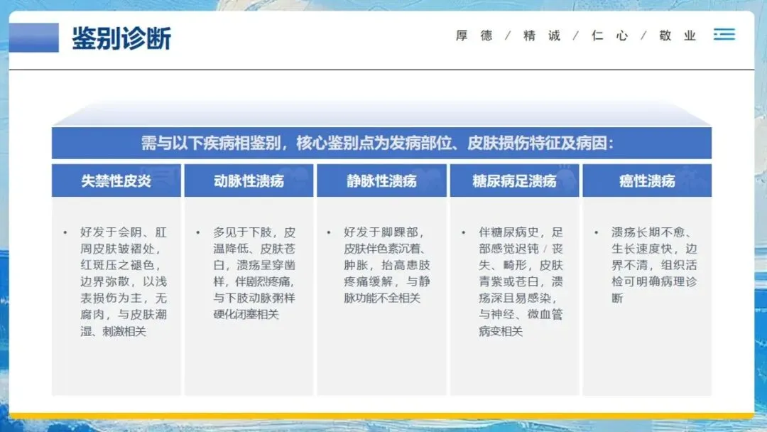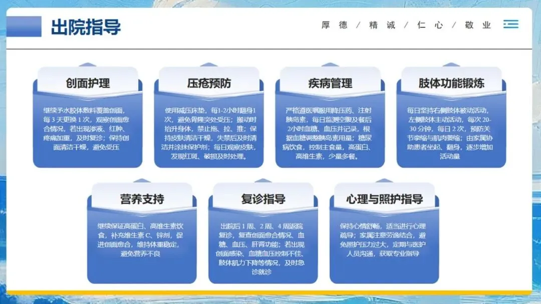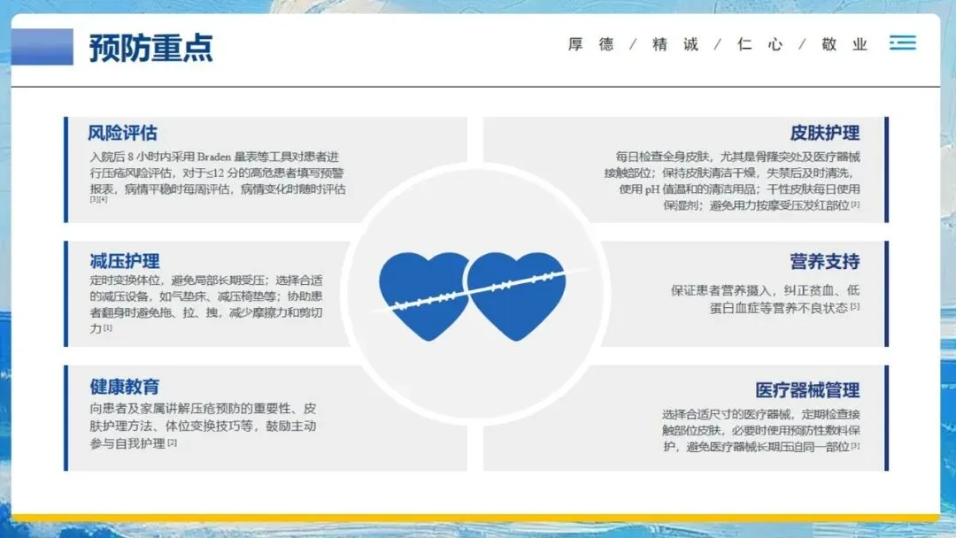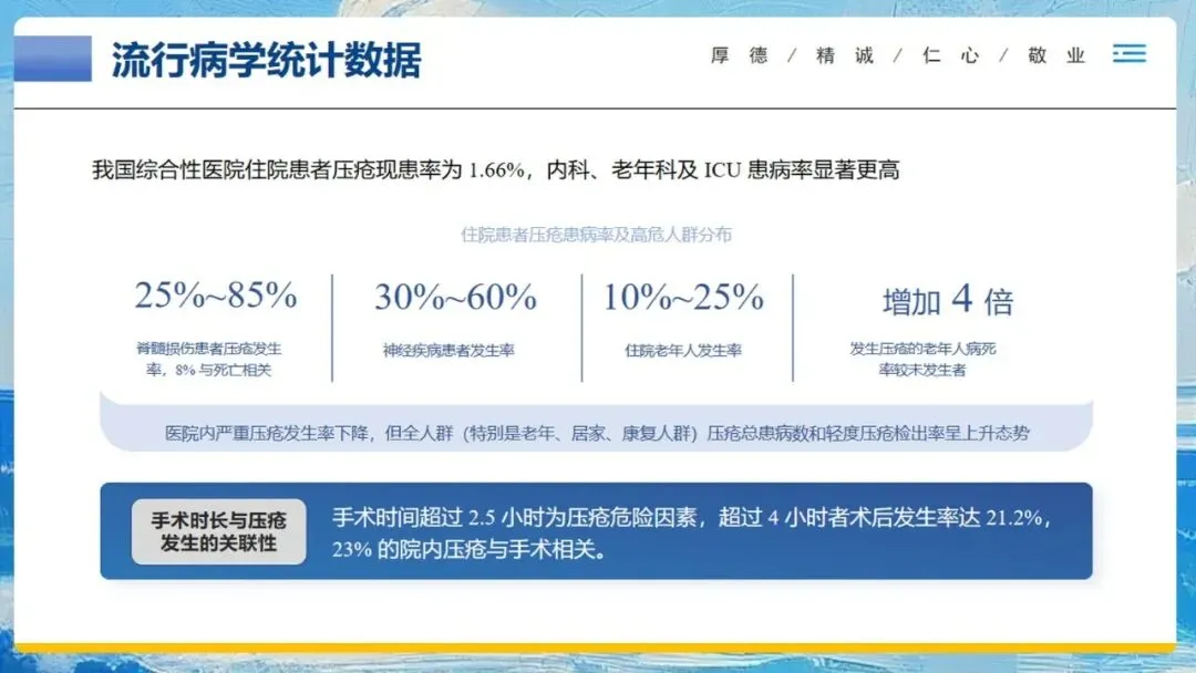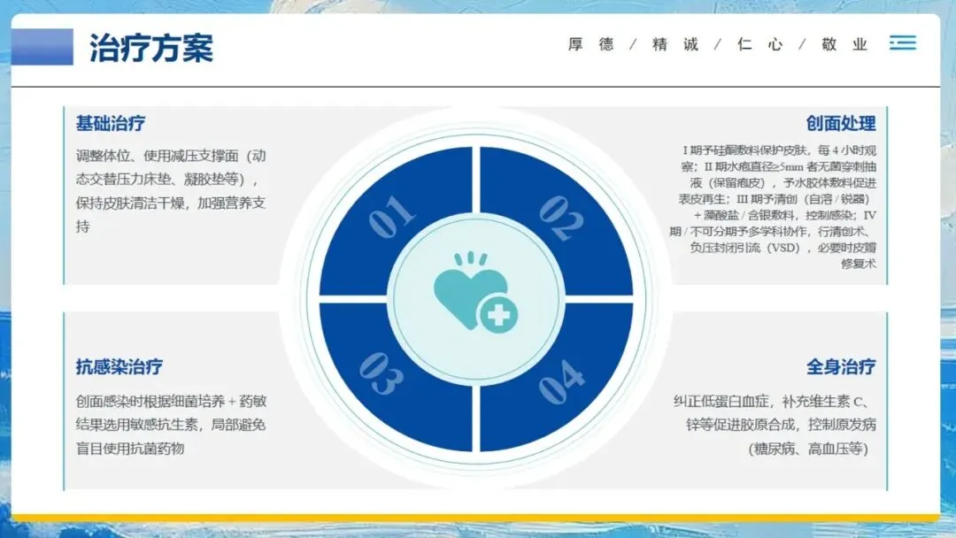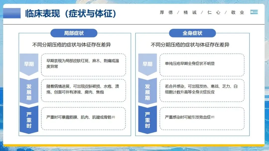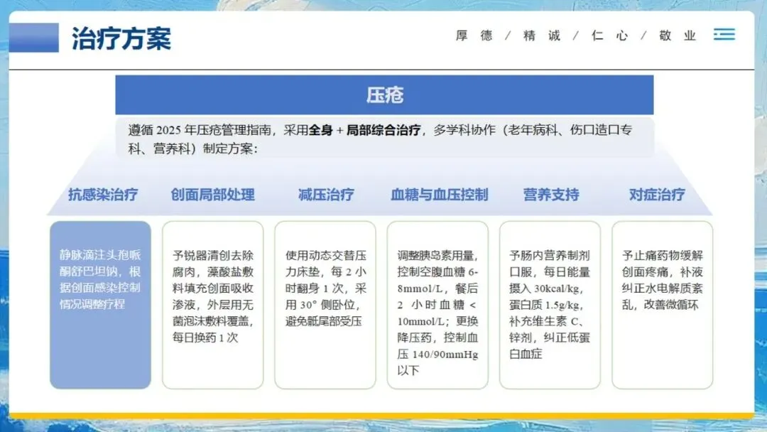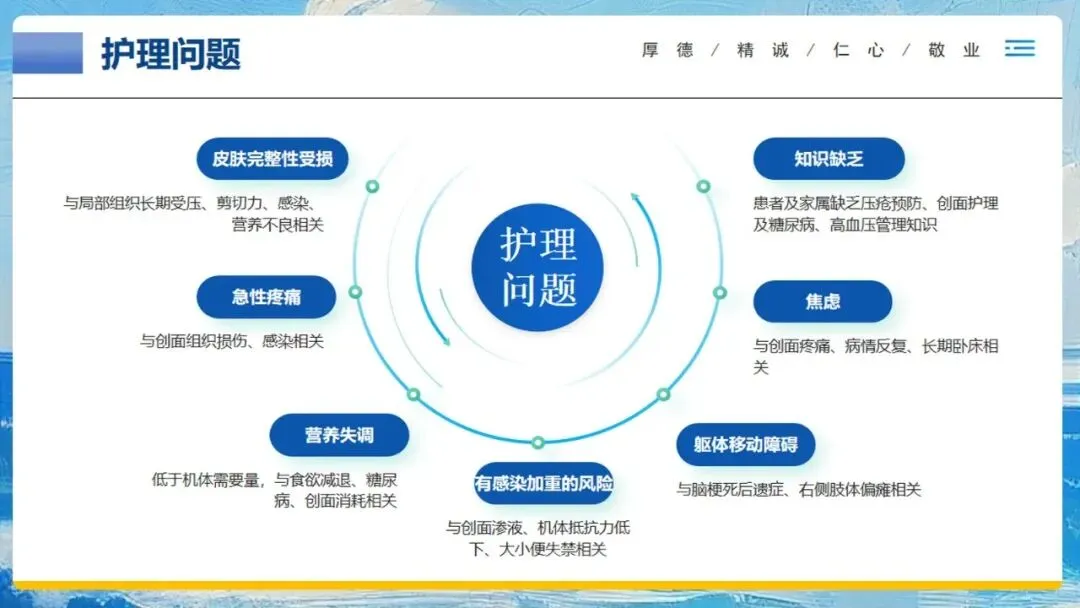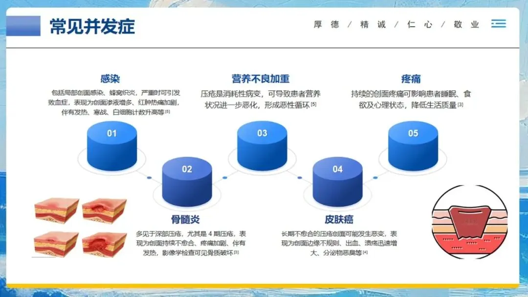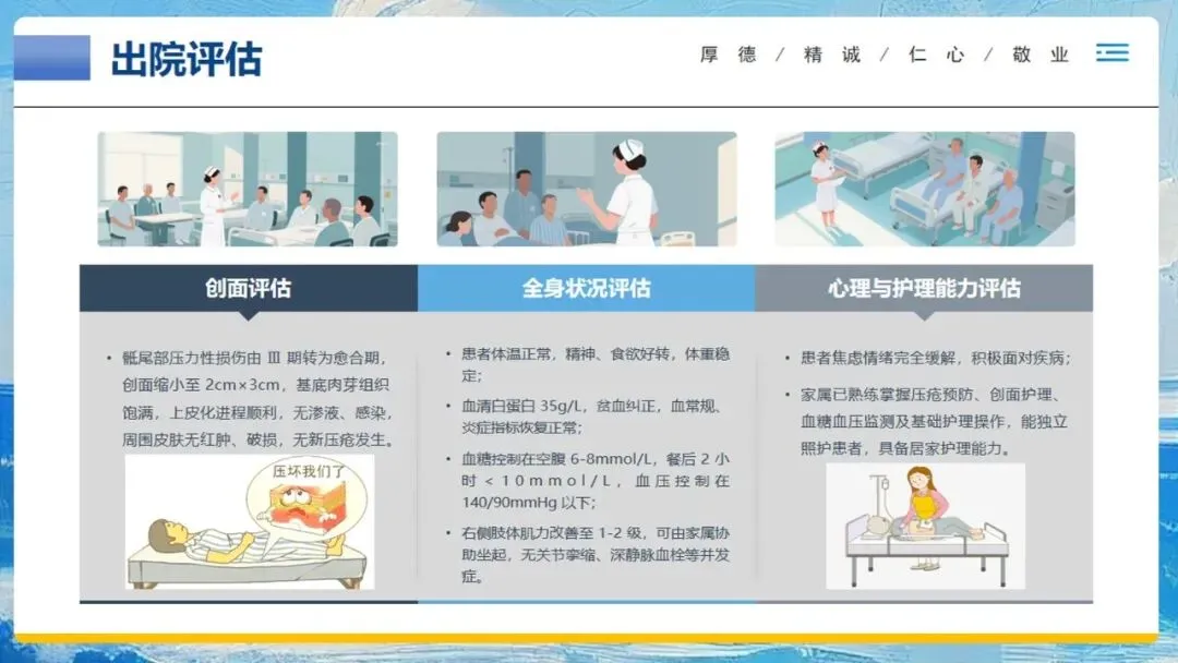 褥疮又称压力性损伤或压力性溃疡,是皮肤和/或皮下组织的局部损伤,多位于骨隆突处。它由压力单独或与剪切力、摩擦力共同作用引起,损伤可表现为完整皮肤或开放性溃疡,部分伴有疼痛,且深层组织损伤可能早于皮肤明显改变发生。其核心病理基础是局部组织长期受压导致血液循环障碍,引发缺血、缺氧和营养缺乏。常见好发部位包括骶尾部、足跟、股骨大转子等。该病症多见于长期卧床、坐轮椅等行动不便人群,早期识别与科学护理对预防其恶化至关重要。本次1 例褥疮(压力性损伤)患者的个案护理的分享,旨在通过真实病例解析压力性损伤的评估、分期及护理要点,提升团队对难愈性伤口的处理能力,强化预防意识,促进患者康复。