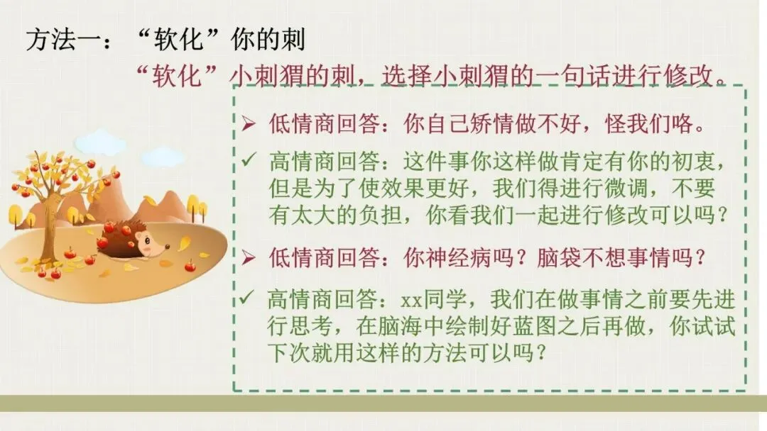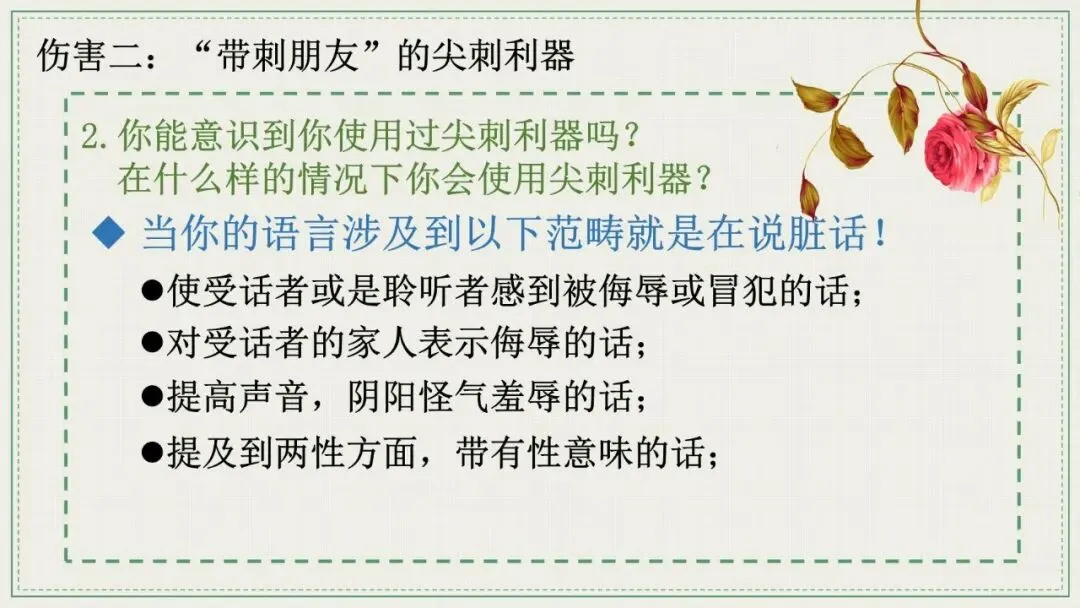 班会用26句真实“带刺话语”让学生现场朗读,让他们听见那些平时脱口而出的话有多刺耳。再通过“软化你的刺”练习,教会学生用高情商表达代替低情商伤人话。最后用“脏话发展三阶段”警示学生:从模仿到习惯,从习惯到成瘾,别让脏话成为你的标签。