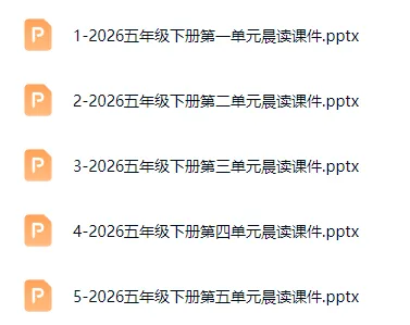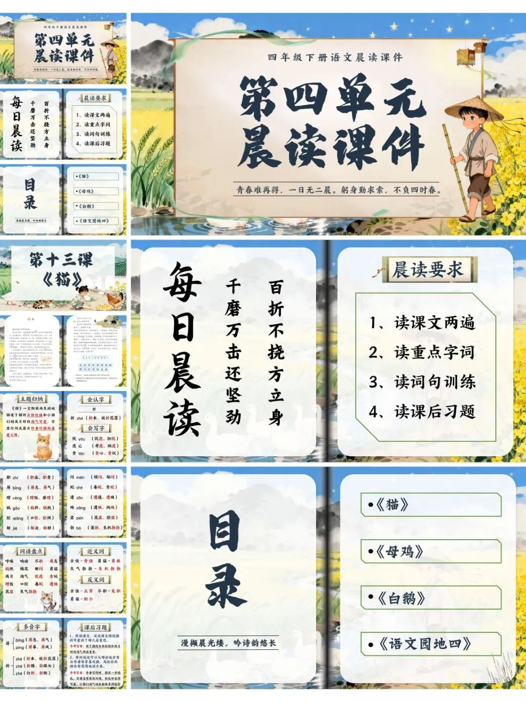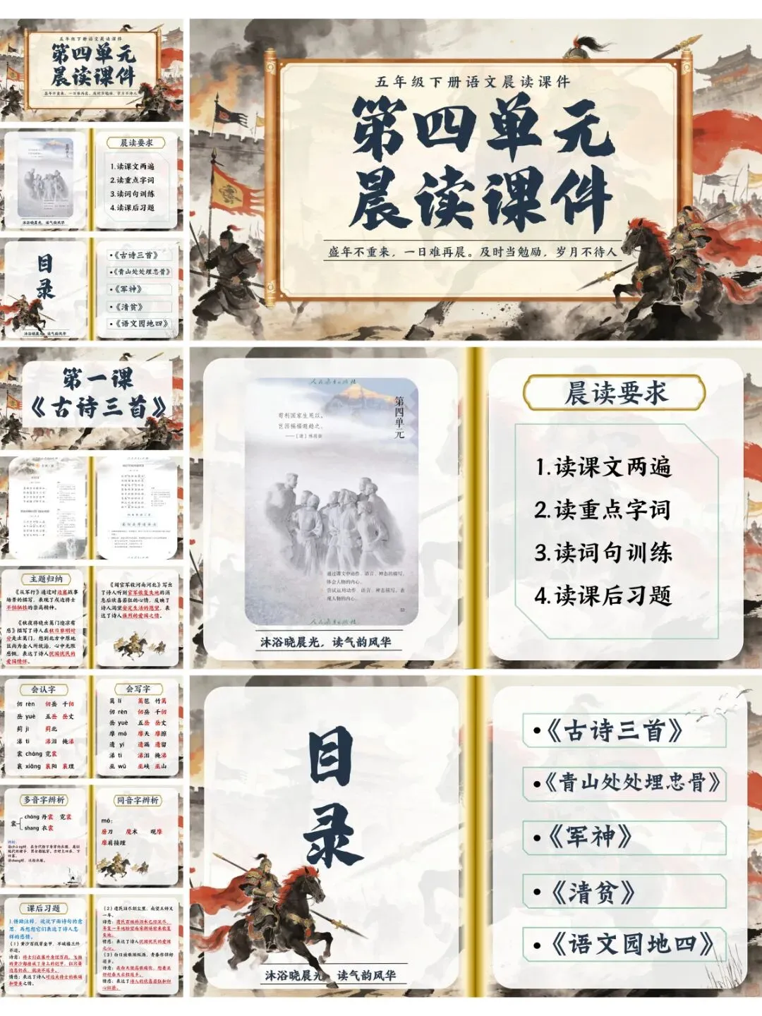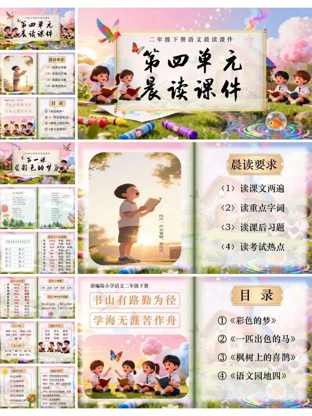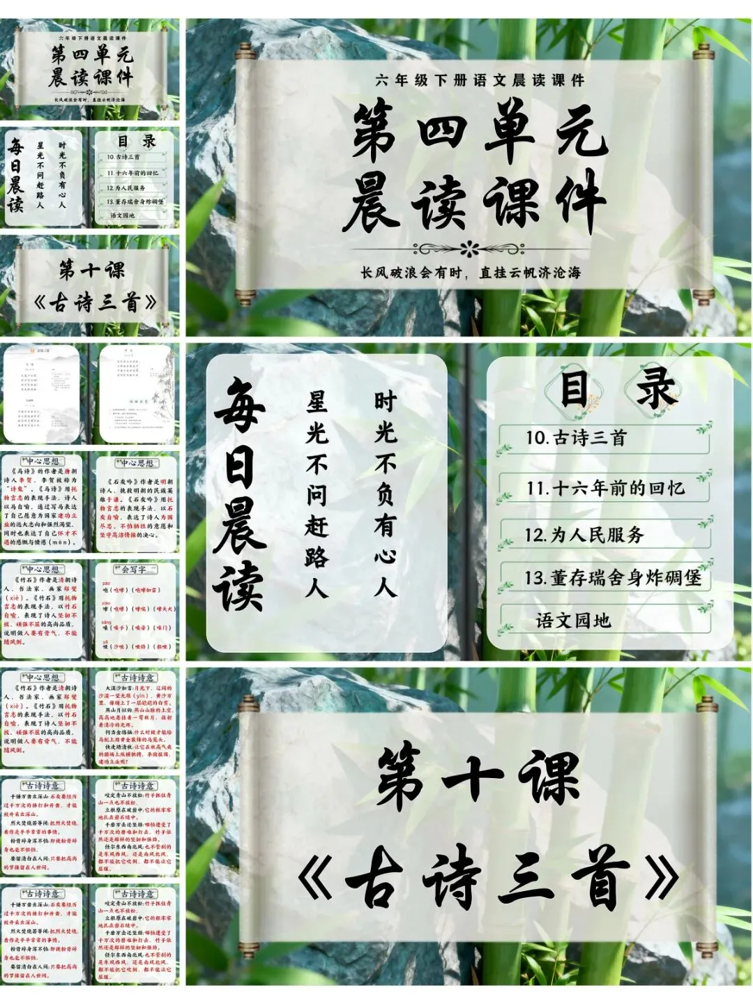 今日分享2026年春《一二三四五六年级语文晨读课件》电子版可编辑。一年之计在于春,一日之计在于晨。孩子们早上起来精神好,记忆佳,坚持每日晨读,对于打好语文基础非常重要,这套晨读课件设计精美,精选课文中重点字词、短语、课文内容等,目前已经更新到第四第五单元,全册都有!老师可以让孩子们每日晨读10分钟,打好基础考试更轻松!