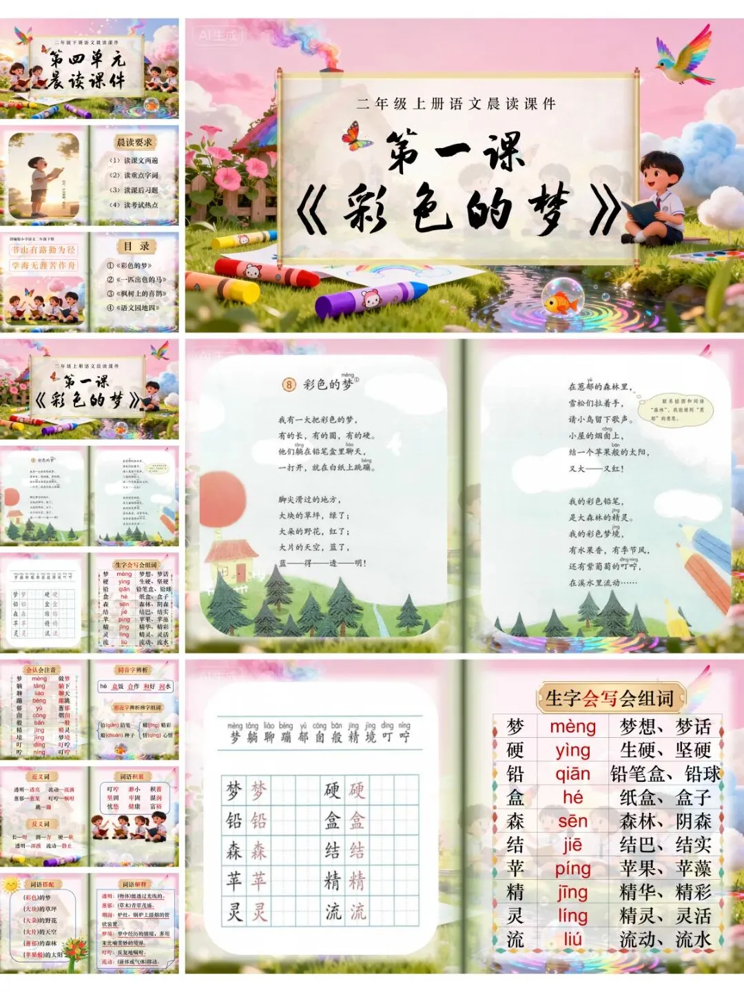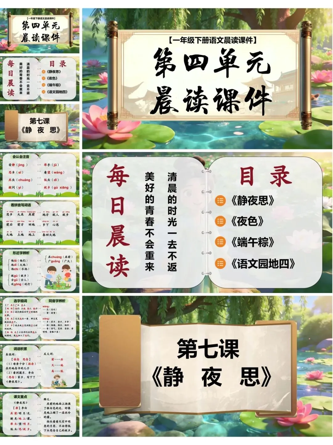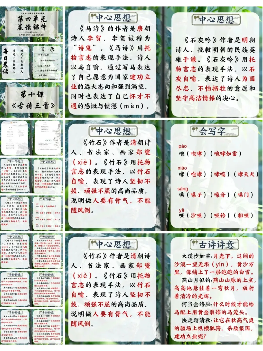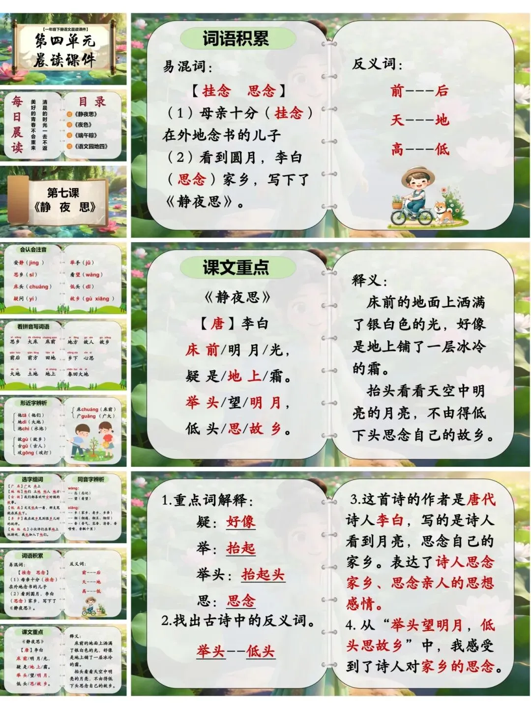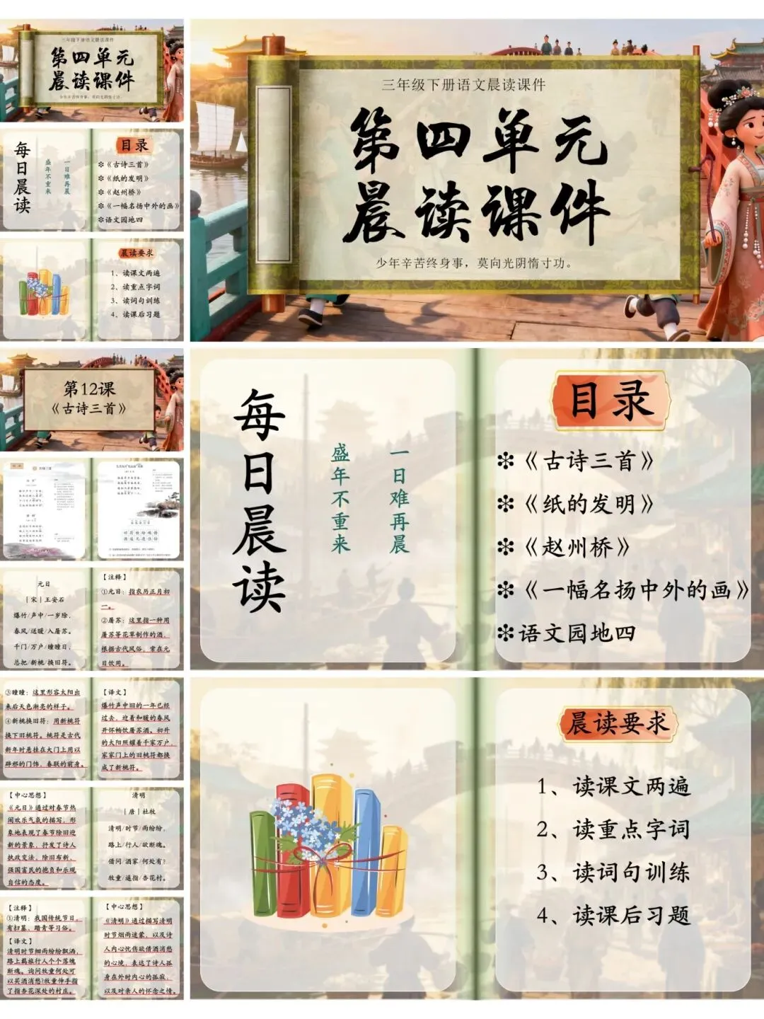 今日分享2026年春《一二三四五六年级语文晨读课件》电子版可编辑。一年之计在于春,一日之计在于晨。孩子们早上起来精神好,记忆佳,坚持每日晨读,对于打好语文基础非常重要,这套晨读课件设计精美,精选课文中重点字词、短语、课文内容等,目前已经更新到第四第五单元,全册都有!老师可以让孩子们每日晨读10分钟,打好基础考试更轻松!