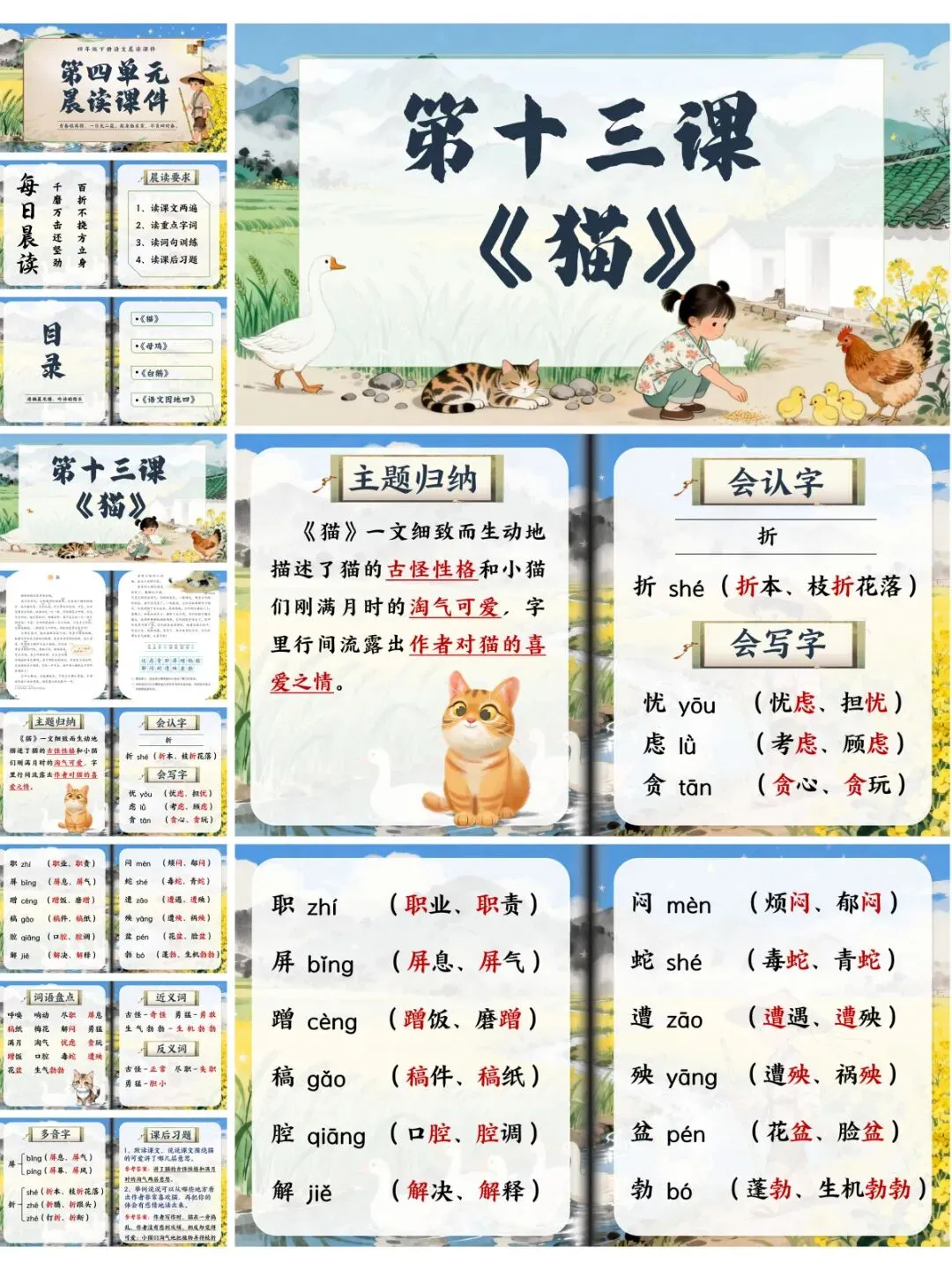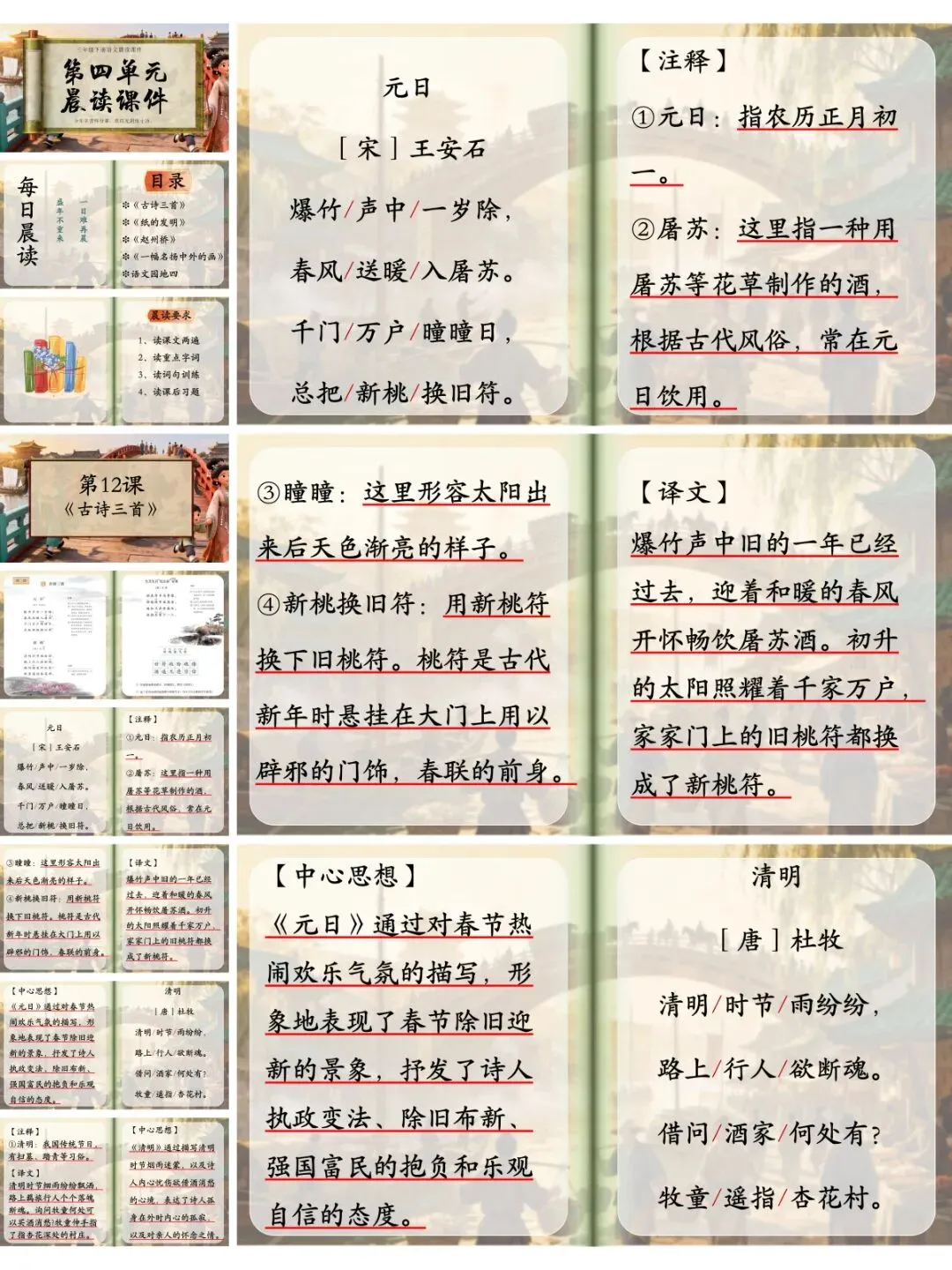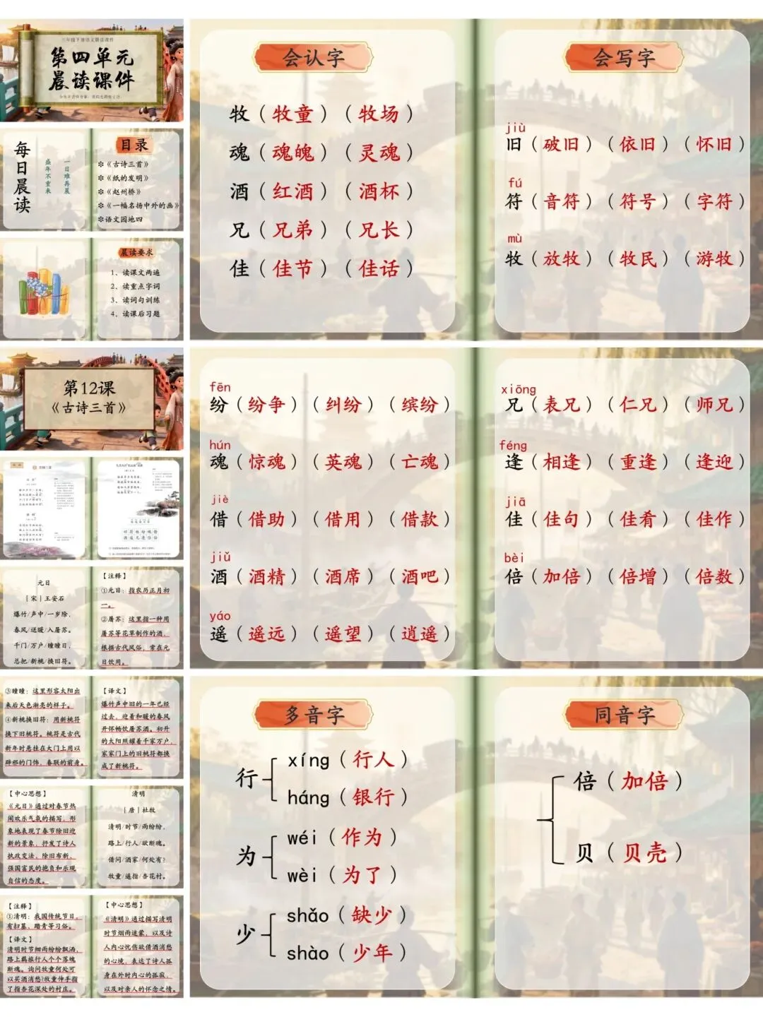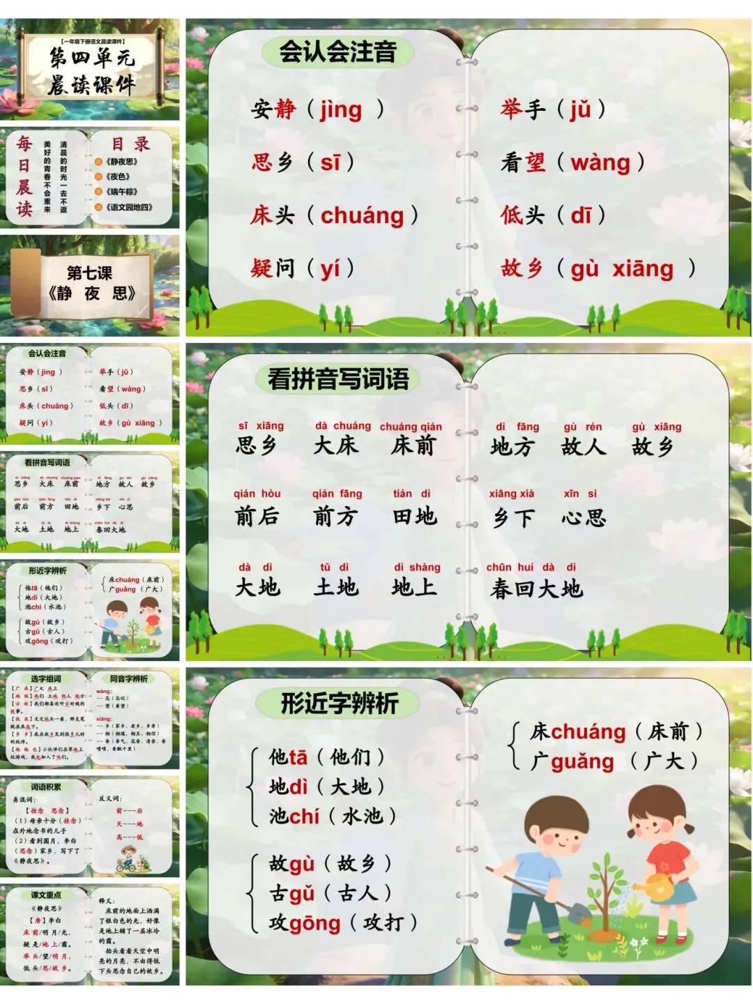 今日分享2026年春《一二三四五六年级语文晨读课件》电子版可编辑。一年之计在于春,一日之计在于晨。孩子们早上起来精神好,记忆佳,坚持每日晨读,对于打好语文基础非常重要,这套晨读课件设计精美,精选课文中重点字词、短语、课文内容等,目前已经更新到第四第五单元,全册都有!老师可以让孩子们每日晨读10分钟,打好基础考试更轻松!