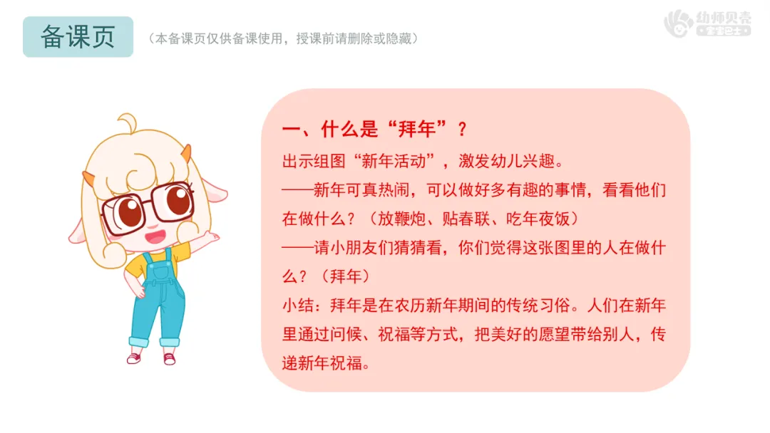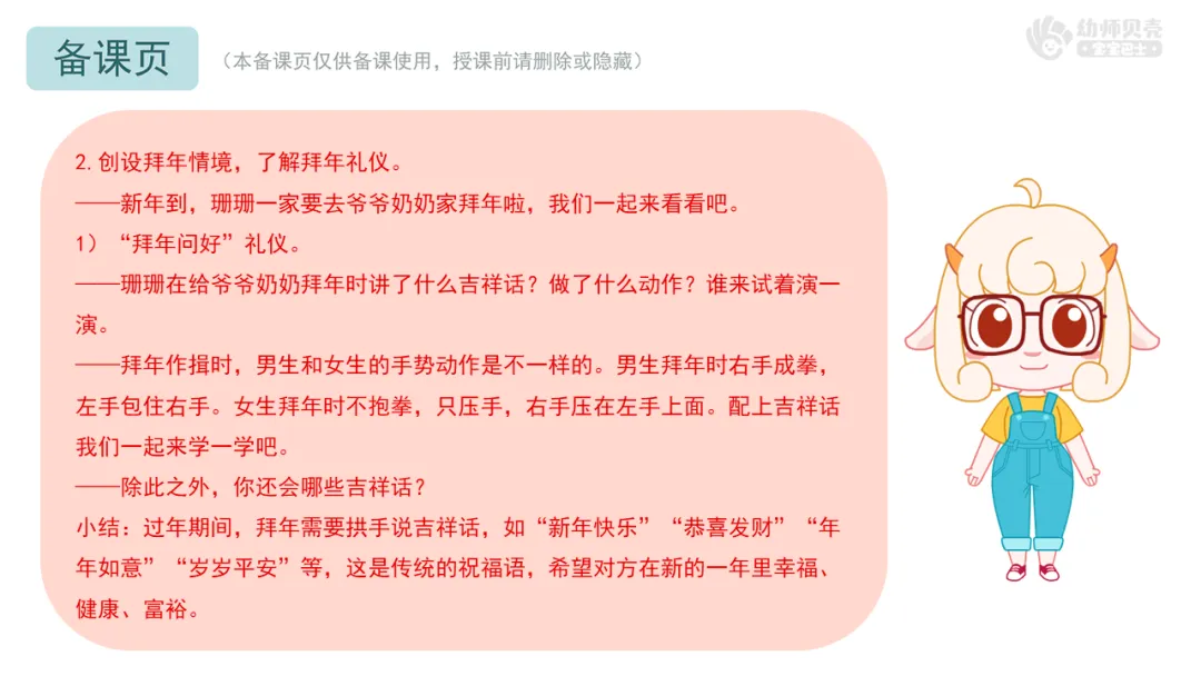 将拜年礼仪细化为语言、动作和行为规范(如双手接红包、不当面拆红包等),帮助幼儿形成清晰、具体的行为认知,具有较强的现实指导意义。