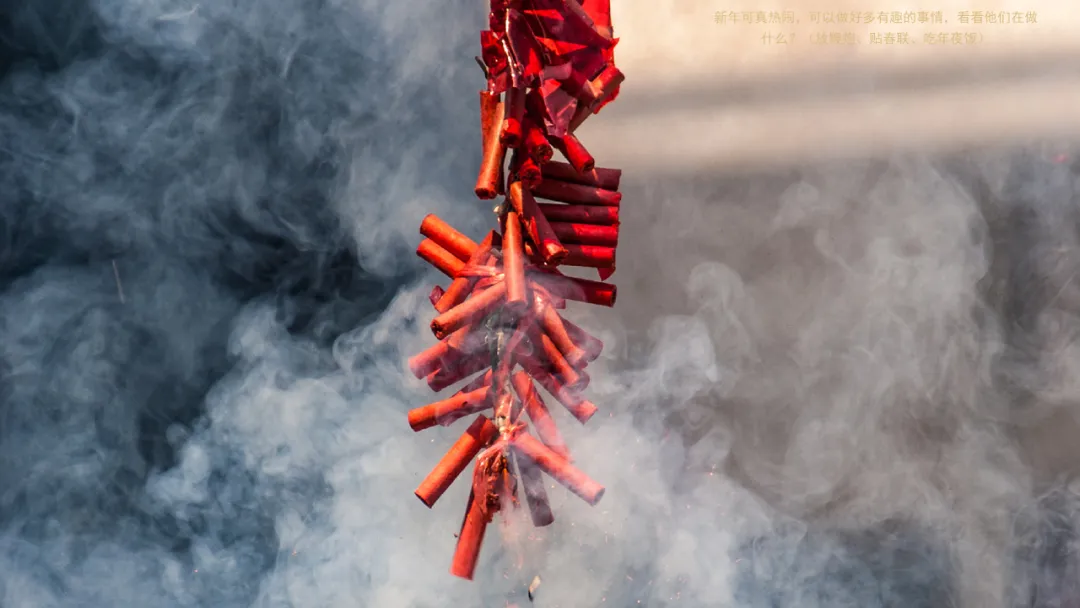 ——新年可真热闹,可以做好多有趣的事情,看看他们在做什么?(放鞭炮、贴春联、吃年