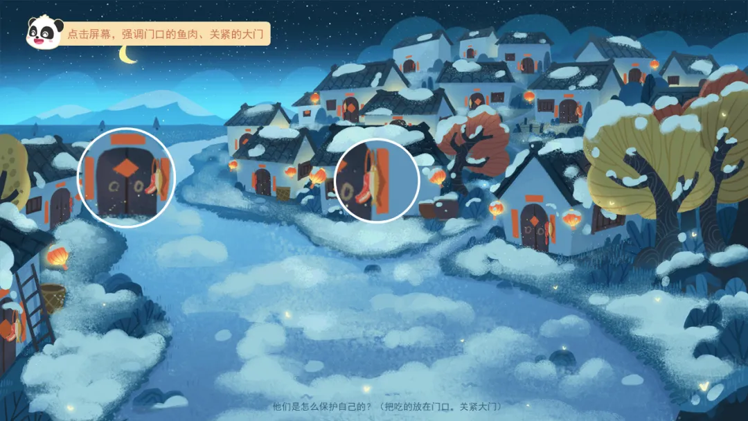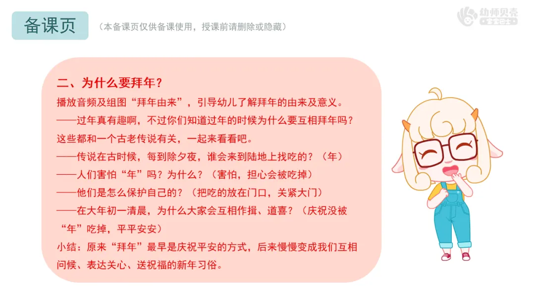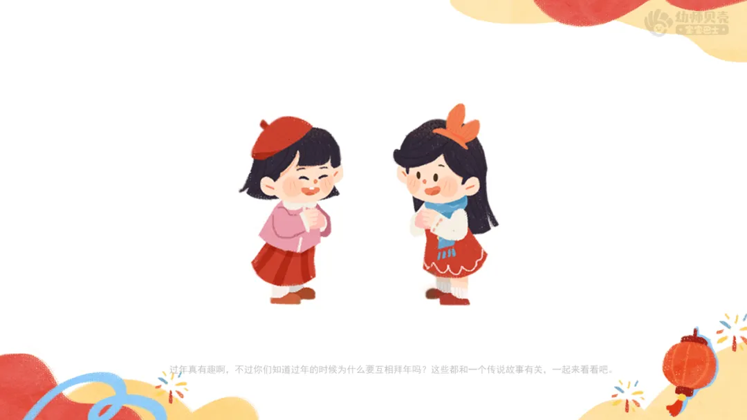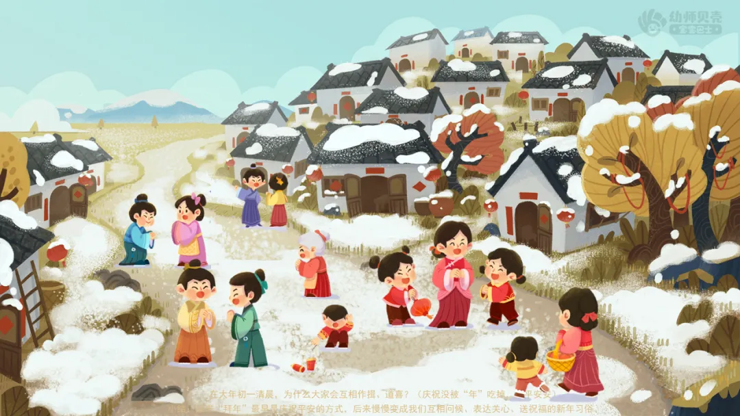 播放音频及组图“拜年由来”,引导幼儿了解拜年的由来及意义。 ——过年真有趣啊,不过你们知道过年的时候为什么要互相拜年吗?这些都和一个古老传说有关,一起来看看吧。 ——传说在古时候,每到除夕夜,谁会来到陆地上找吃的?(年) ——人们害怕“年”吗?为什么?(害怕,担心会被吃掉) ——他们是怎么保护自己的?(把吃的放在门口,关紧大门) ——在大年初一清晨,为什么大家会互相作揖、道喜?(庆祝没被“年”吃掉,平平安安) 小结:原来“拜年”最早是庆祝平安的方式,后来慢慢变成我们互相问候、表达关心、送祝福的新年习俗。