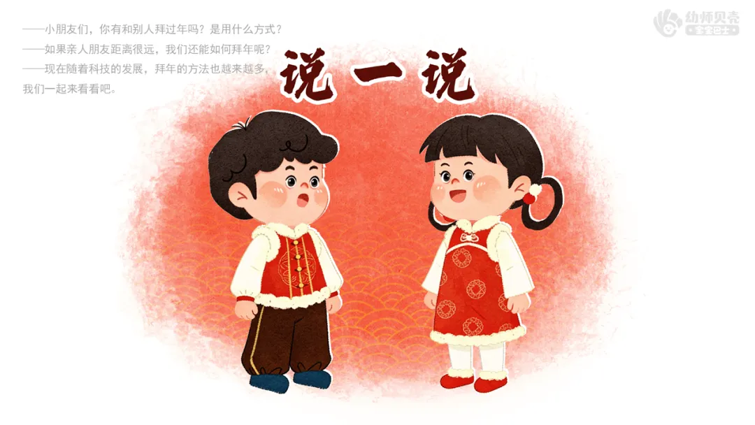 1.联系已有经验,分享交流多种多样的拜年方式。 ——小朋友们,你有和别人拜年过吗?是用什么方式? ——如果亲人朋友距离很远,我们还能如何拜年呢? ——现在随着科技的发展,拜年的方法也越来越多,我们一起来看看吧。小结:拜年的方式有很多:可以见面拜年、打电话、写贺卡,也可以用微信视频等新媒体来拜年。不论用哪种方式,最重要的都是把祝福送给别人,让大家在新的一年里感到快乐和温暖。2.创设拜年情境,了解拜年礼仪。