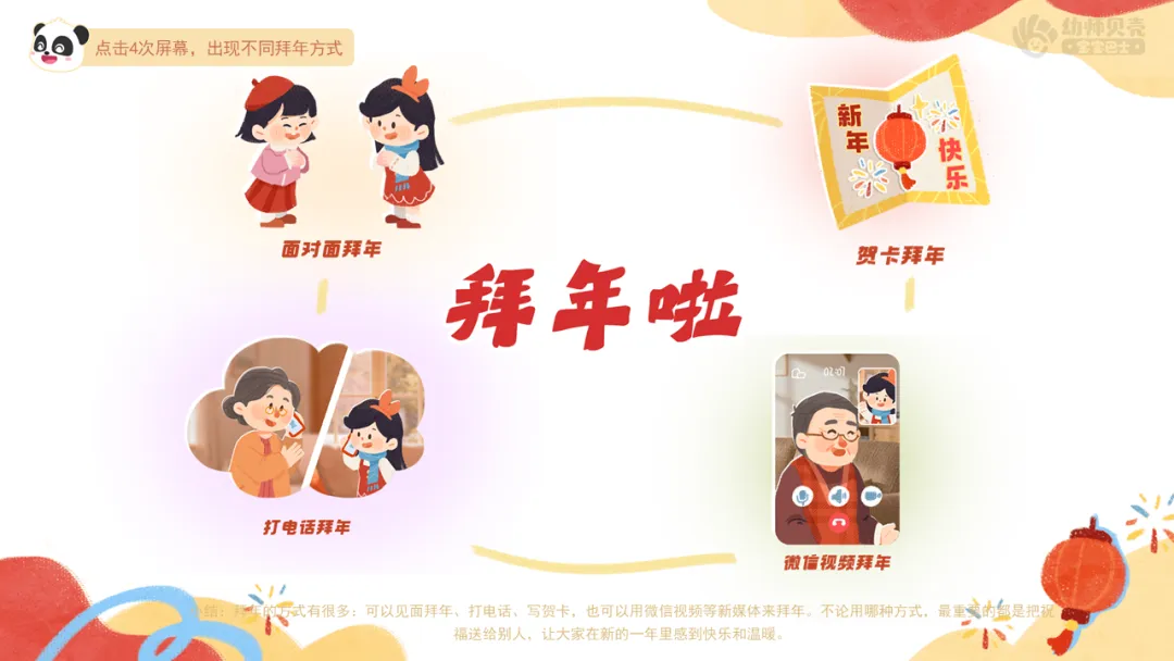 请家长在春节期间,引导幼儿用正确拜年方式向家中长辈拜年(如作揖、说吉祥话、双手接红包等),并鼓励幼儿选择一种方式向远方的亲友送上新年祝福,如:微信语音、视频、电话或手工贺卡等。