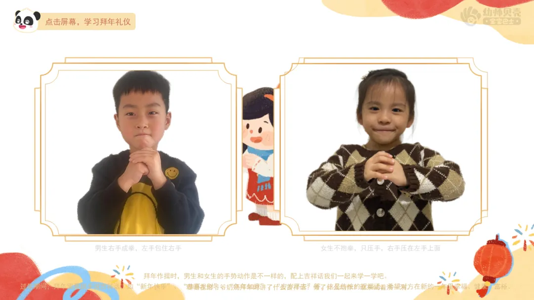 ——拜年作揖时,男生和女生的手势动作是不一样的。男生拜年时右手成拳,左手包住右手。女生拜年时不抱拳,只压手,右手压在左手上面。配上吉祥话我们一起来学一学吧。 ——除此之外,你还会哪些吉祥话?