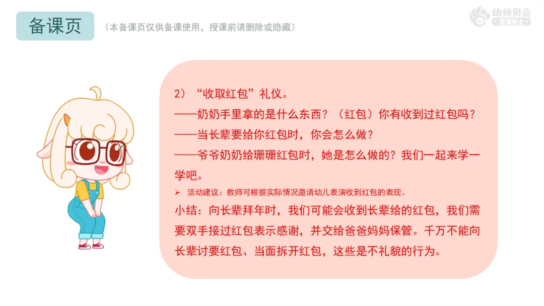 小结:向长辈拜年时,我们可能会收到长辈给的红包,我们需要双手接过红包表示感谢,并交给爸爸妈妈保管。千万不能向长辈讨要红包、当面拆开红包,这些是不礼貌的行为。