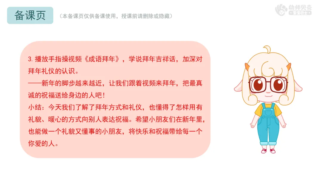 ——新年的脚步越来越近,让我们跟着视频来拜年,把最真诚的祝福送给身边的人吧! 小结:今天我们了解了拜年方式和礼仪,也懂得了怎样用有礼貌、暖心的方式向别人表达祝福。希望小朋友们在新年里,也能做一个礼貌又懂事的小朋友,将快乐和祝福带给每一个你爱的人。