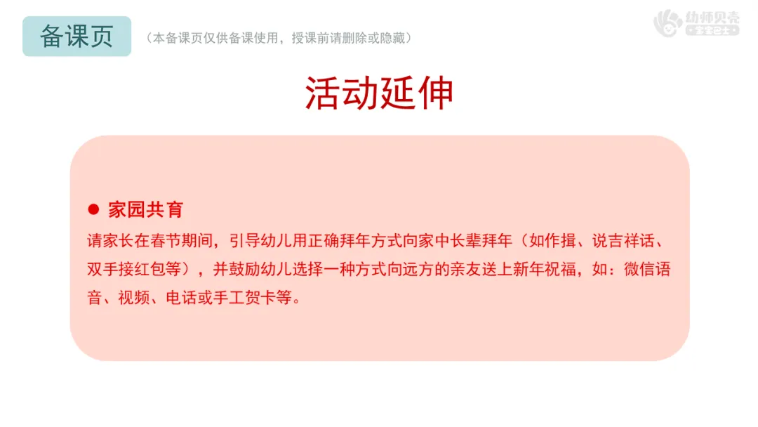 活动延伸紧密结合春节家庭生活,引导家长在真实情境中继续强化幼儿的礼仪行为,有助于学习成果的巩固与迁移。