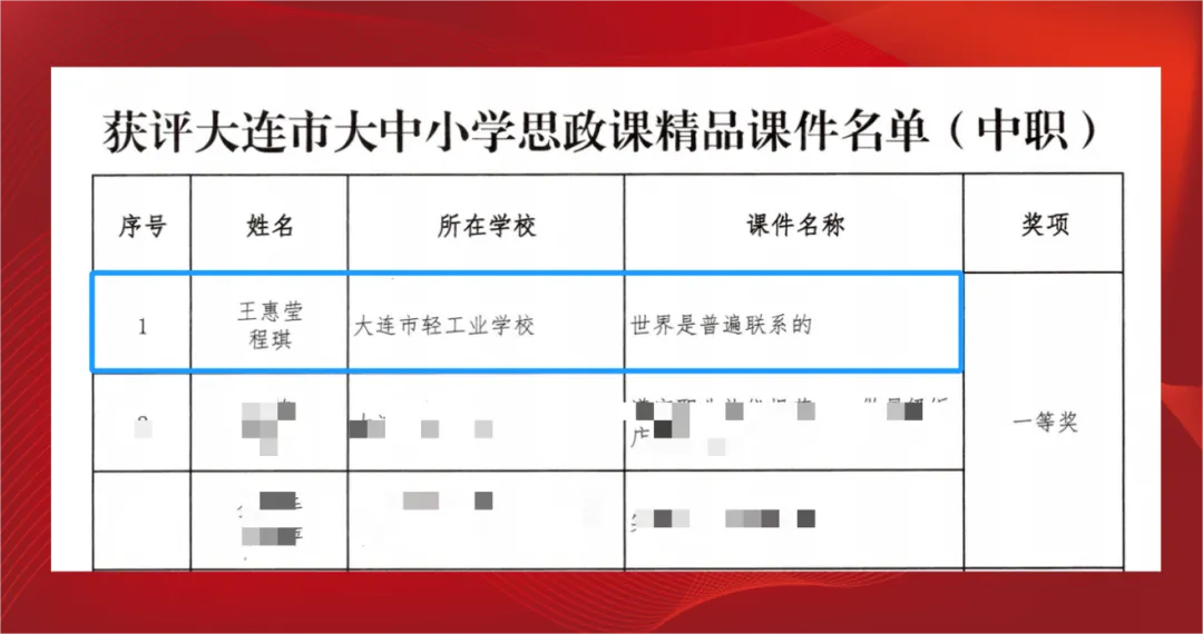 本次评选由大连市教育局、大连教育学院联合组织,标准严格、竞争激烈。评选围绕教学内容、教学设计、技术性、艺术性、创新性五大核心指标,重点考察课件的思政导向、教学创新及育人实效。全市各学段学校积极参与,经层层遴选,最终确定获奖名单。