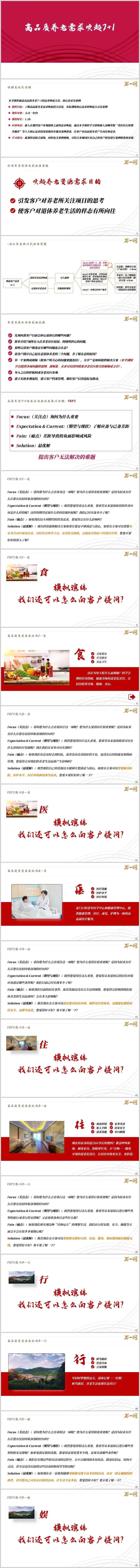 话术示例:“刘叔,您说退休后想多出去走走,为什么‘行’对您这么重要?”(F)“年轻时候忙着工作,亏欠老伴太多,现在想带她看看祖国的大好河山。”“您理想中的旅居生活是什么样的?”(E)“想去海南过冬,去云南避暑,走到哪住到哪,不用赶时间。”“要实现这样的生活,咱们需要准备什么?”(差距揭示)“说实话,最担心的是身体,万一在外地生病怎么办?住宿、交通也要操心。”“如果因为这些担心,一直出不去,您觉得遗憾吗?”(P)“那肯定遗憾,怕就怕等想走的时候走不动了。”“刘叔,如果有一个机构,在全国都有基地,您去哪都有人安排好住宿、餐饮,还有医疗服务跟着,您愿不愿意了解一下?”(S)