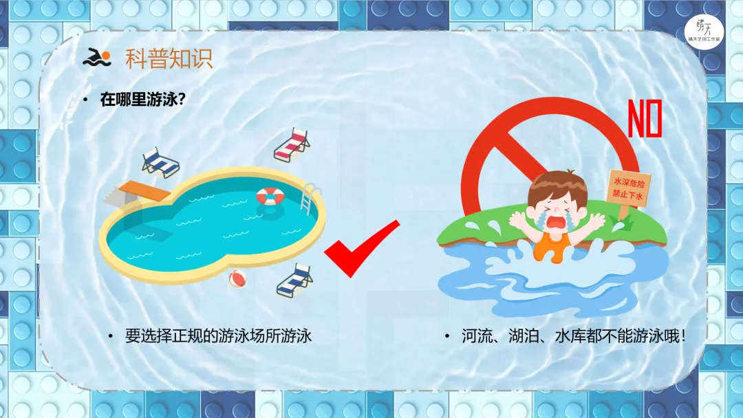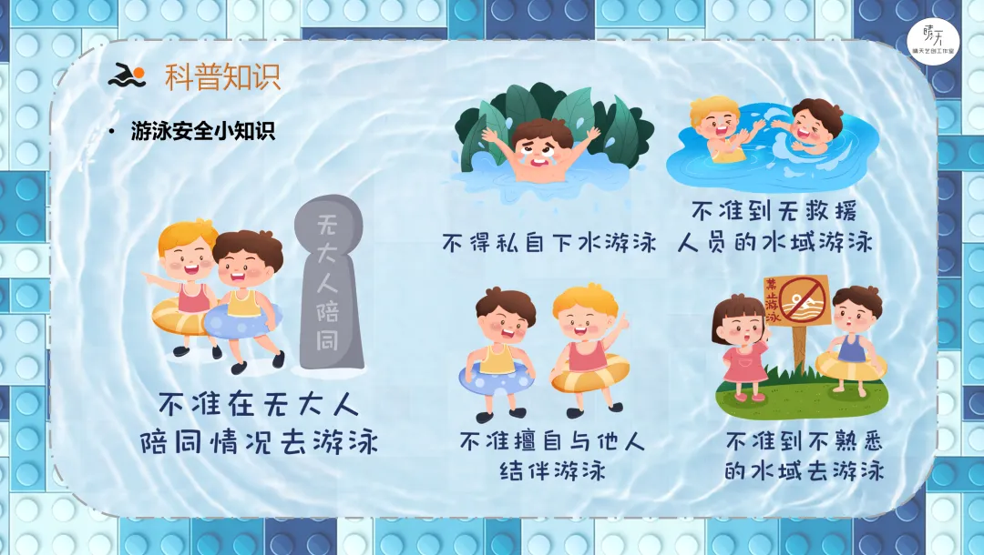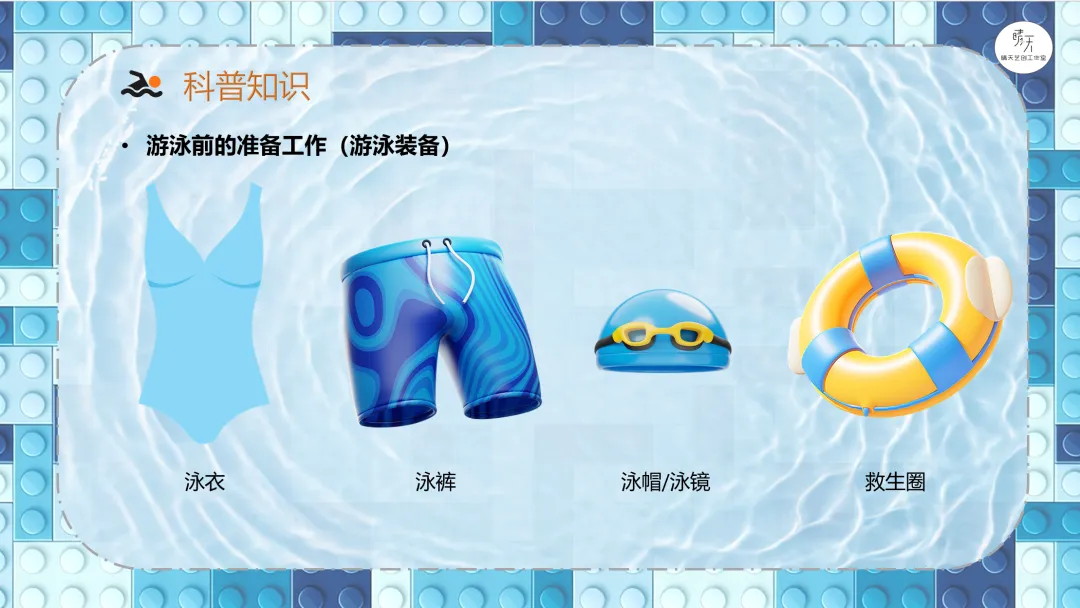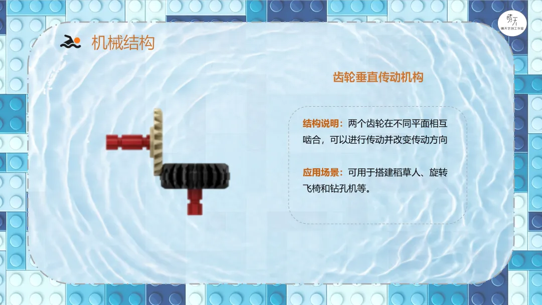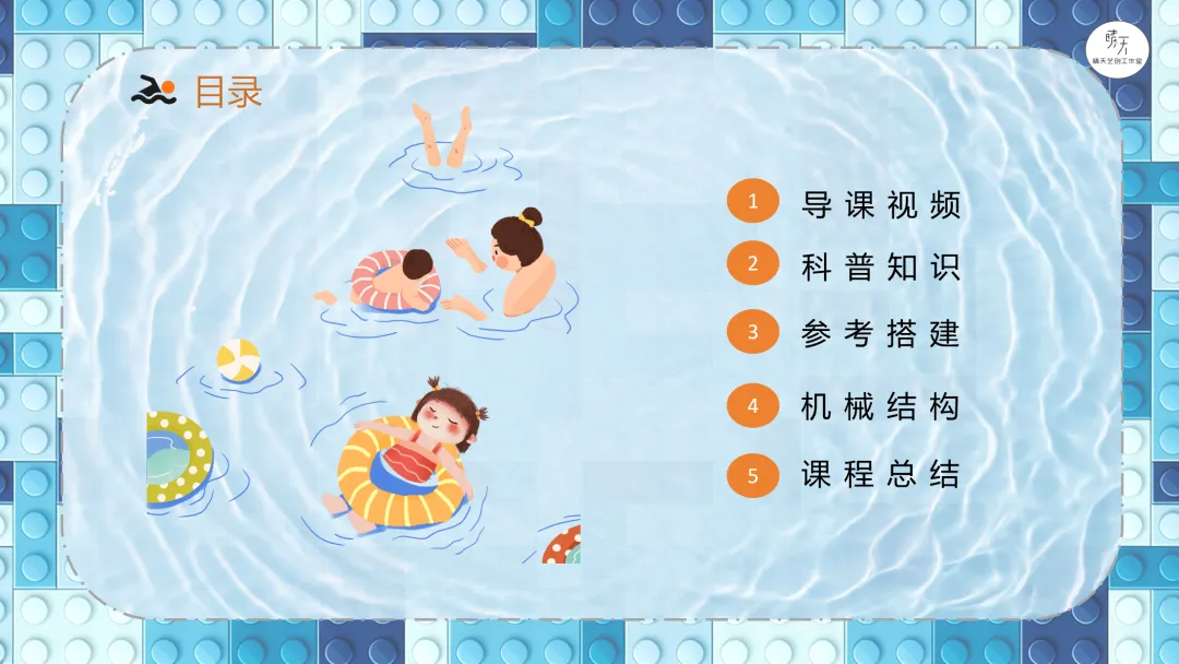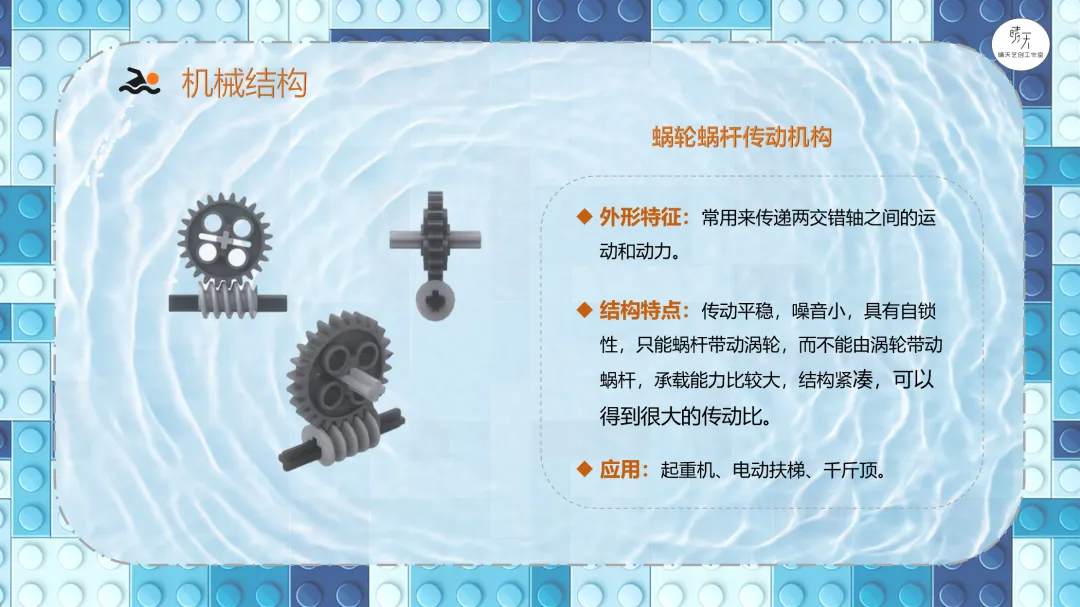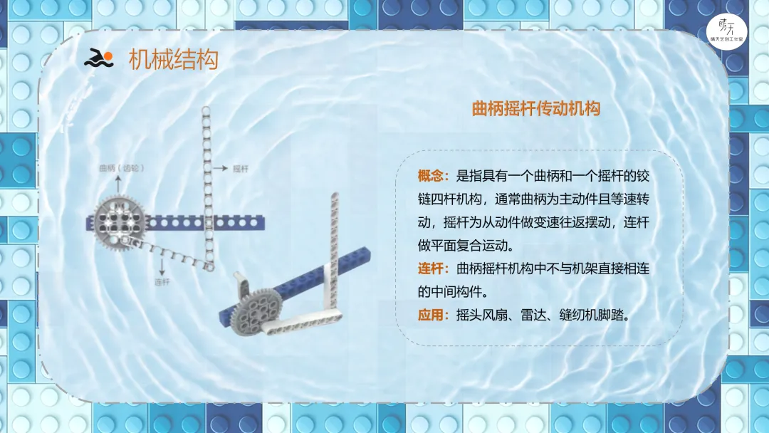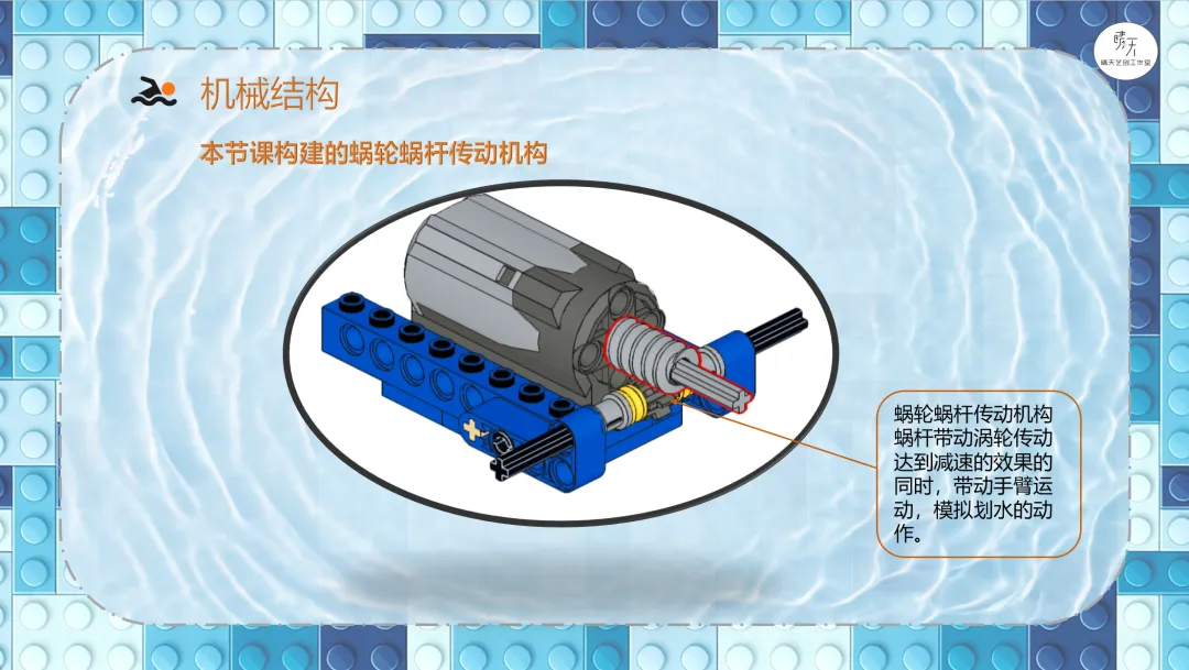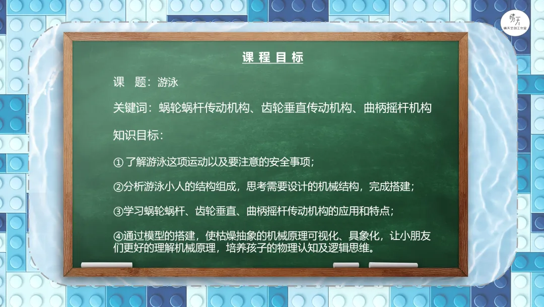 导课视频:视频介绍了游泳需要注意的安全事项(课件中包含原视频)。讲解哪些场所可以去游泳,哪些场所不可以,一定要注意安全。分析游泳小人需要设计什么样的机械结构?展示游泳的参考搭建图。9686《游泳》作品运行视频(课件中包含原视频)。讲解蜗轮蜗杆传动机构的特点、应用以及在本节课作品中的具体应用,加深理解。讲解齿轮垂直传动机构的特点、应用以及在本节课作品中的具体应用,加深理解。讲解曲柄摇杆传动机构的特点、应用以及在本节课作品中的具体应用,加深理解。课程总结,这部分内容主要是方便老师做课后反馈,发家长群使用,老师们请根据需要做适当更改。各位家长,大家好!