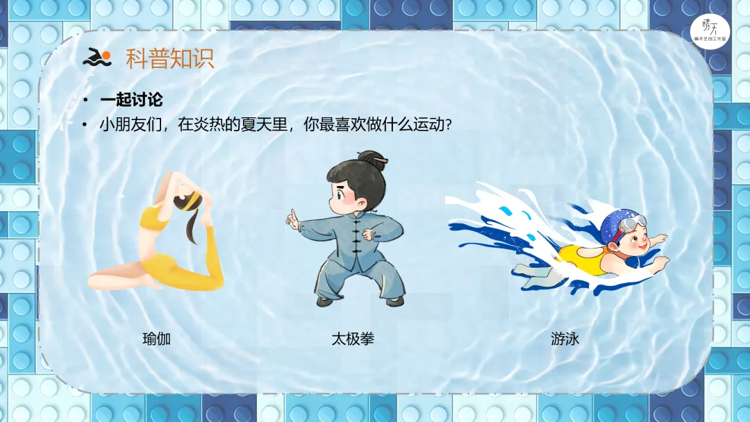 本周孩子们化身仿生运动工程师,用乐高9686套件搭建了活灵活现的游泳小人!在动手搭建中,孩子们既了解了游泳运动的奥秘,又解锁了齿轮垂直传动、曲柄摇杆、蜗轮蜗杆三大机械传动原理。首先,小朋友们互相分享了有关游泳该项运动的相关内容,包括游泳的姿势、好处以及需要注意的安全事项等;